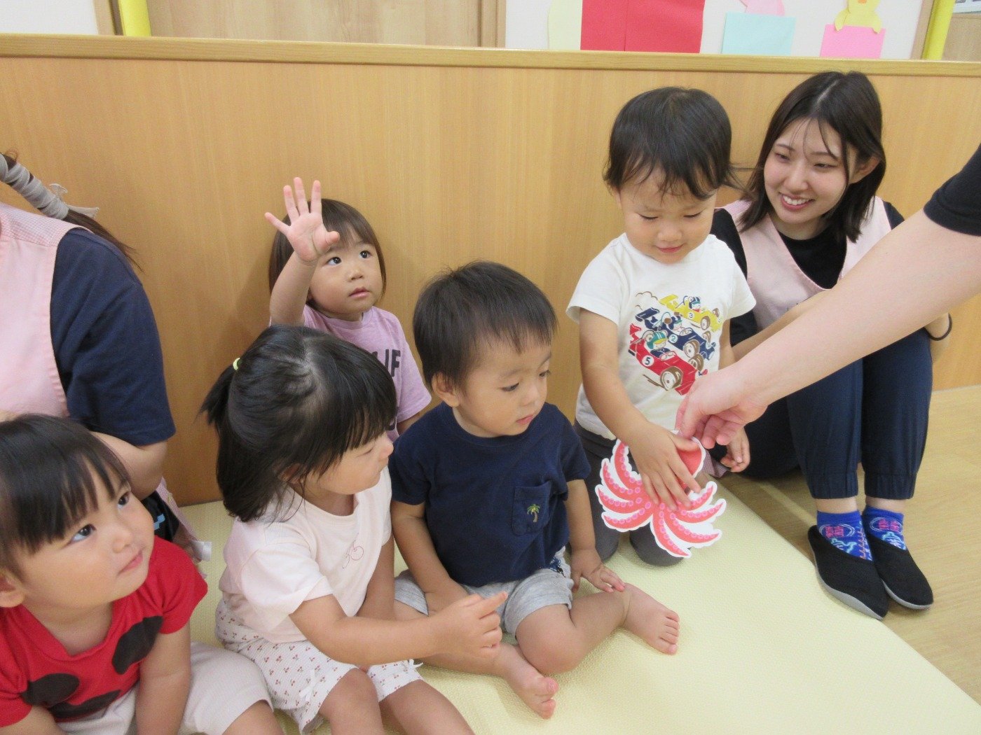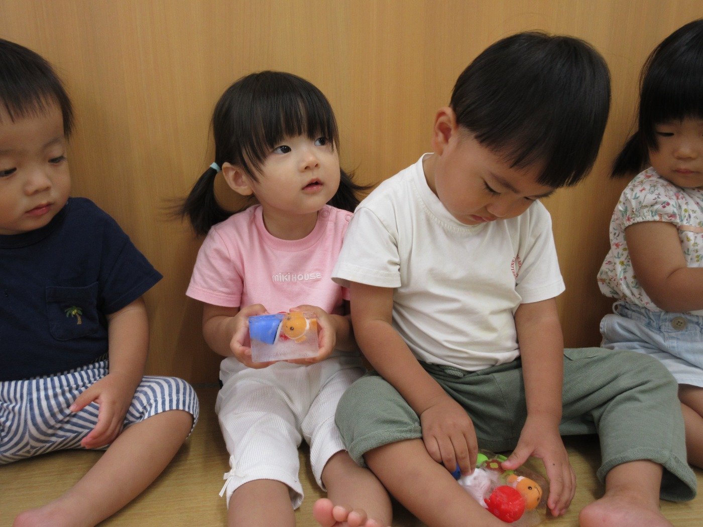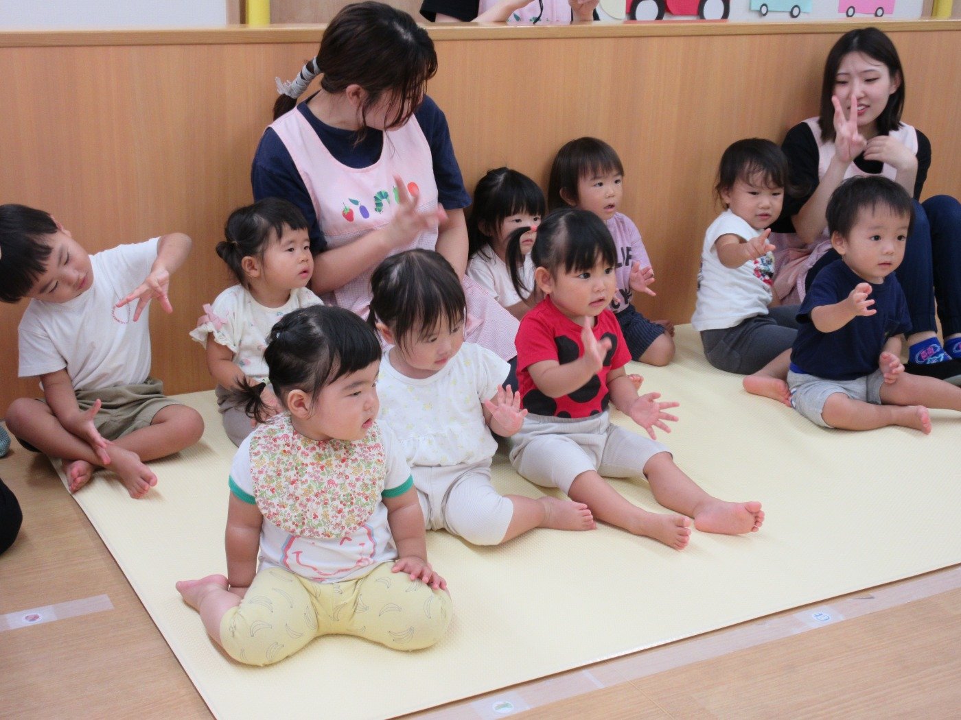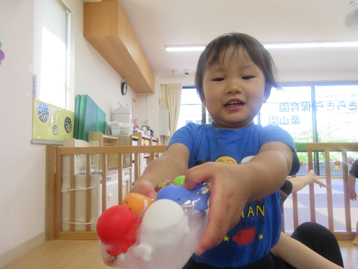 お部屋で「おせんたく」のふれあい遊びを楽しんでいるくま組さん。