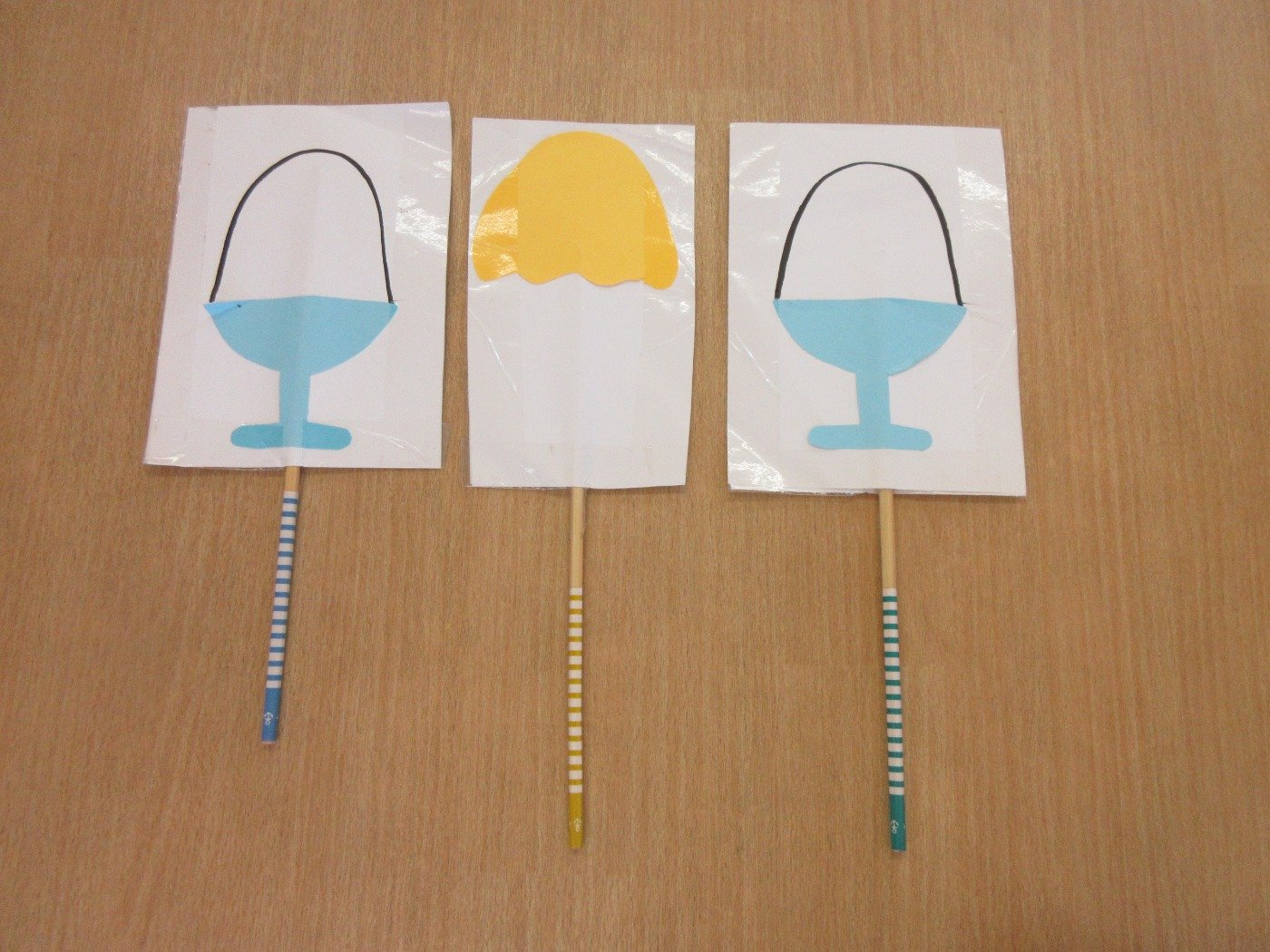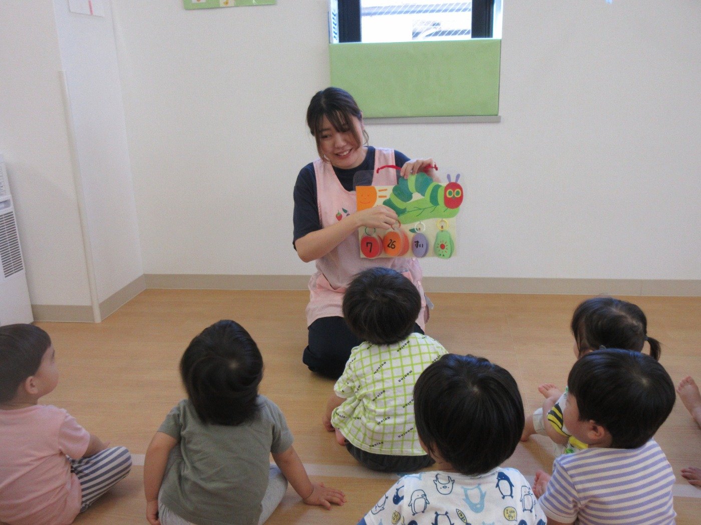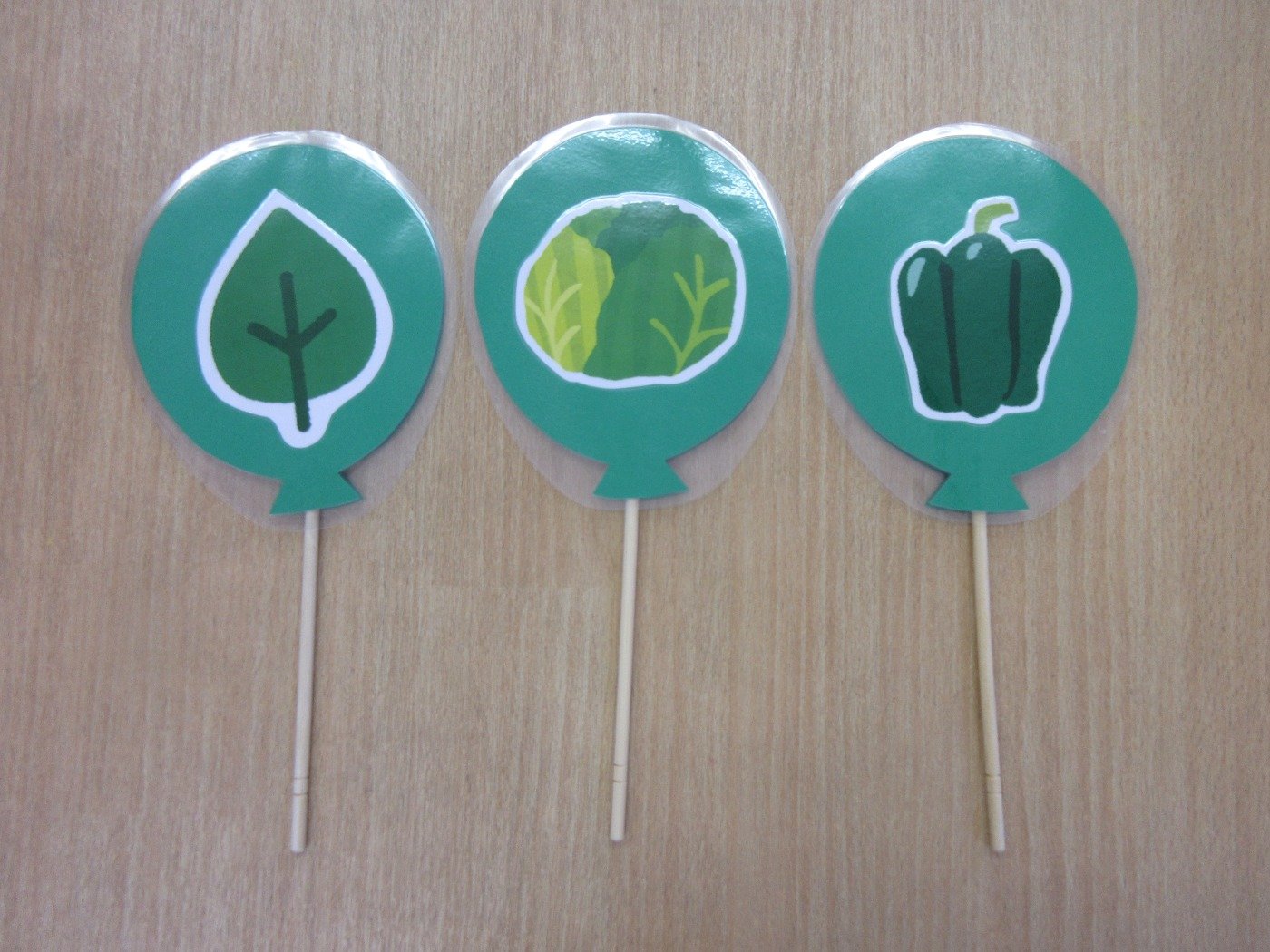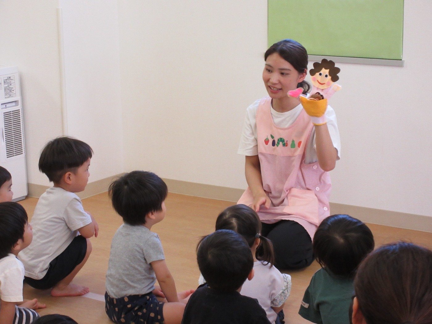 手作りのペープサートやシアターを楽しみながら、色や形、物の名前など自然に見つけていきます。