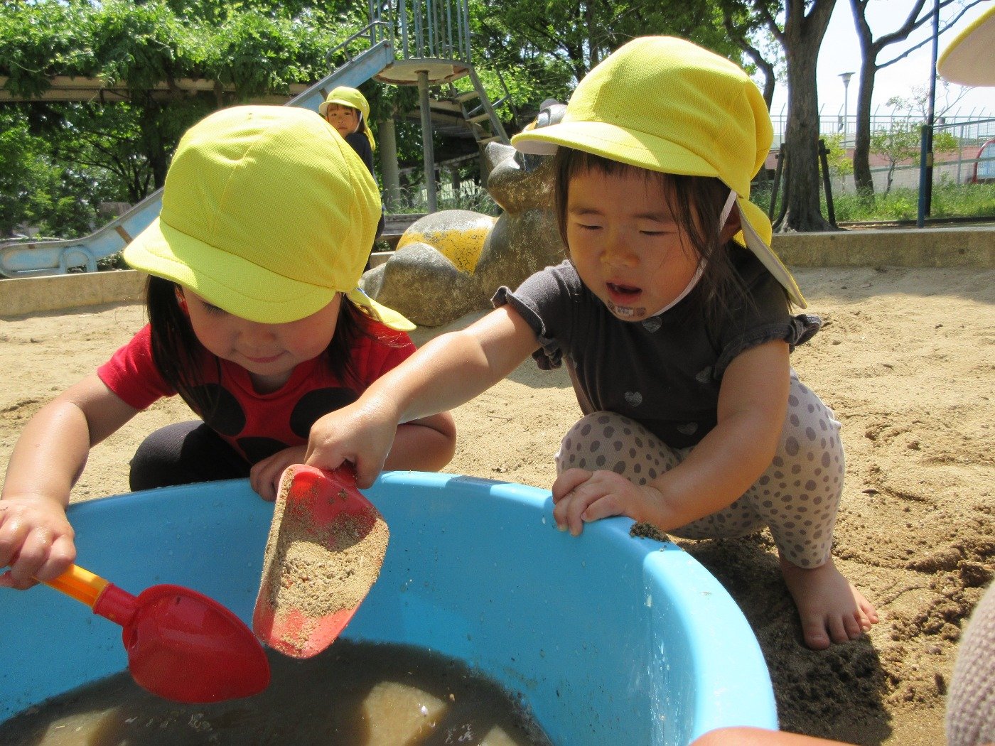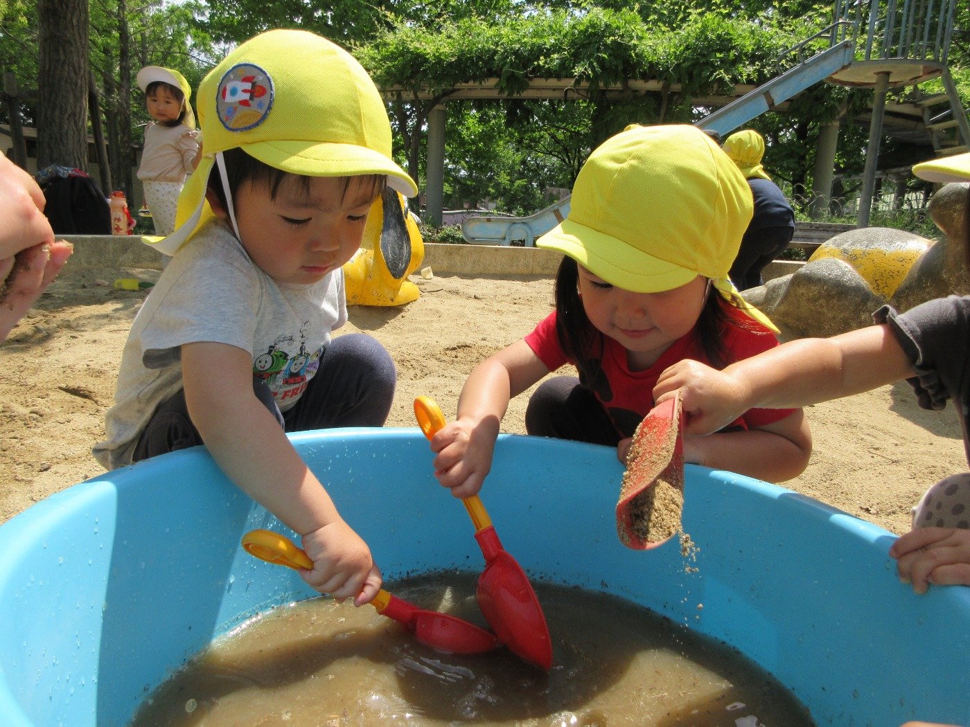 絶好の泥んこ遊びデー♪タライに水を入れてまぜまぜ…