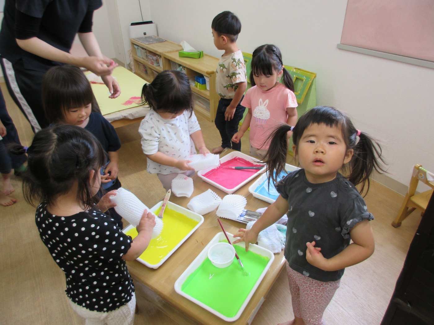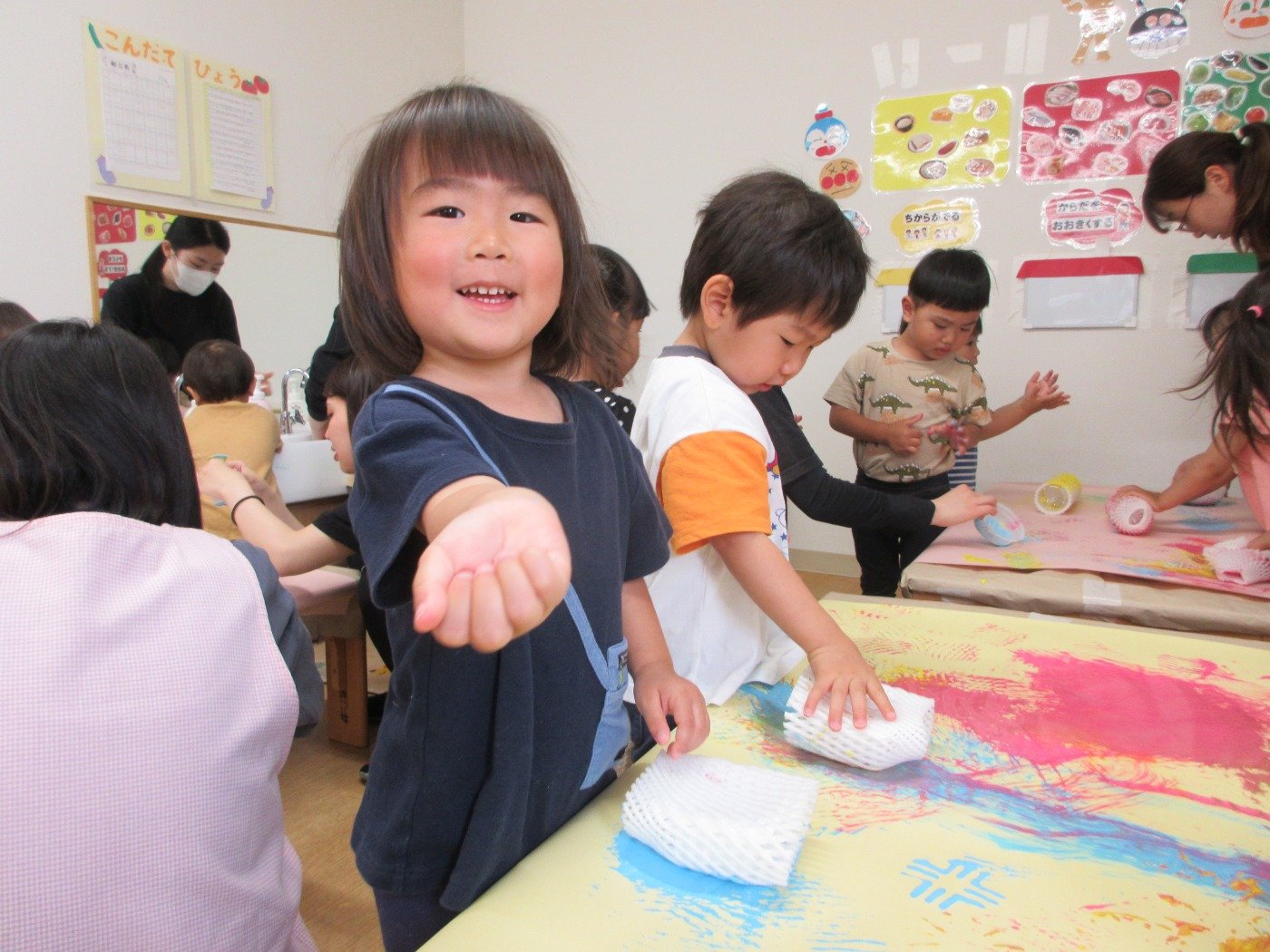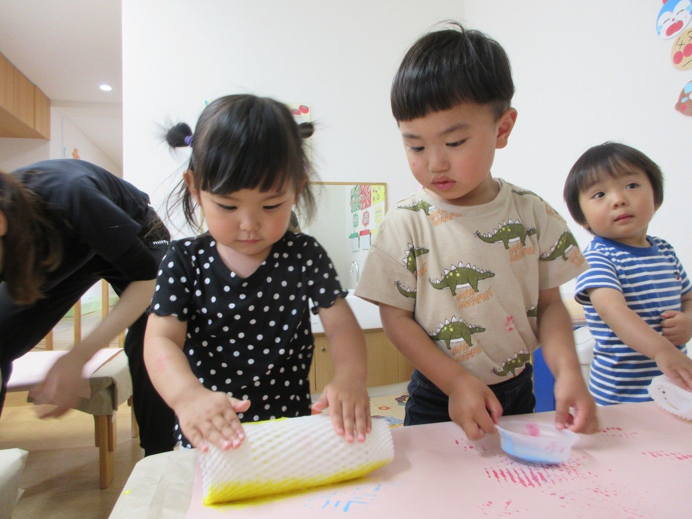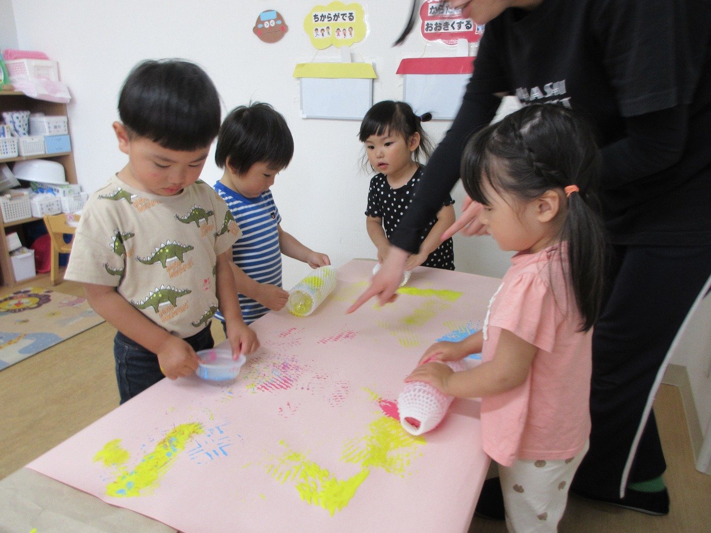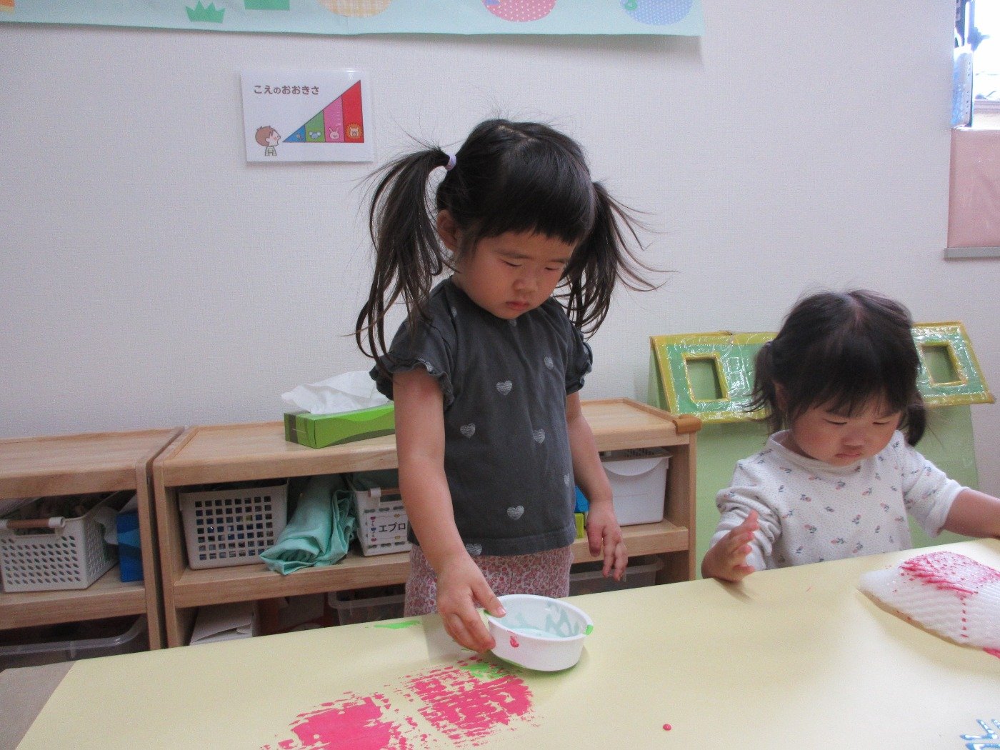 自分で色を選んで、好きなスタンプでペタペタ、コロコロ…