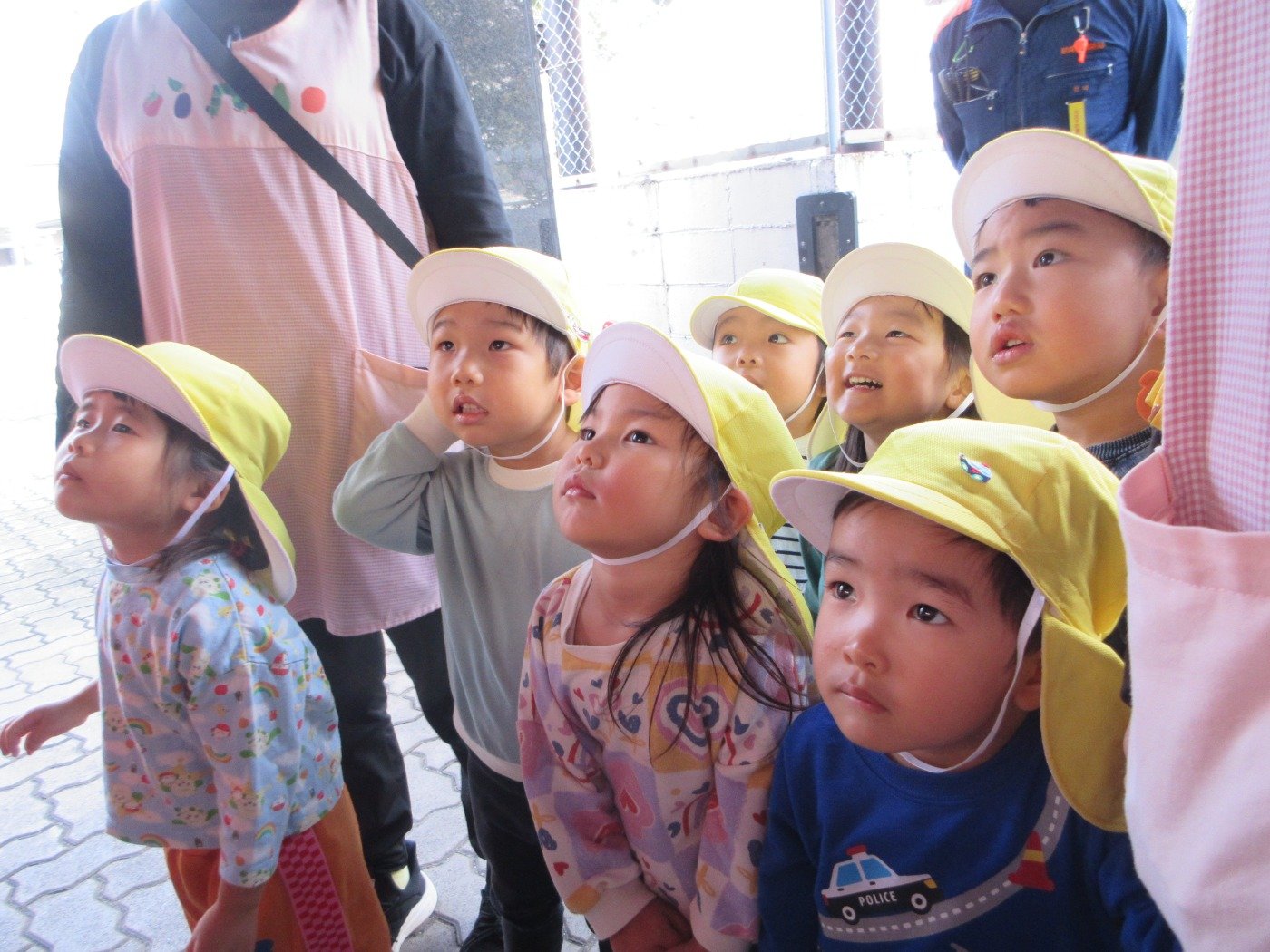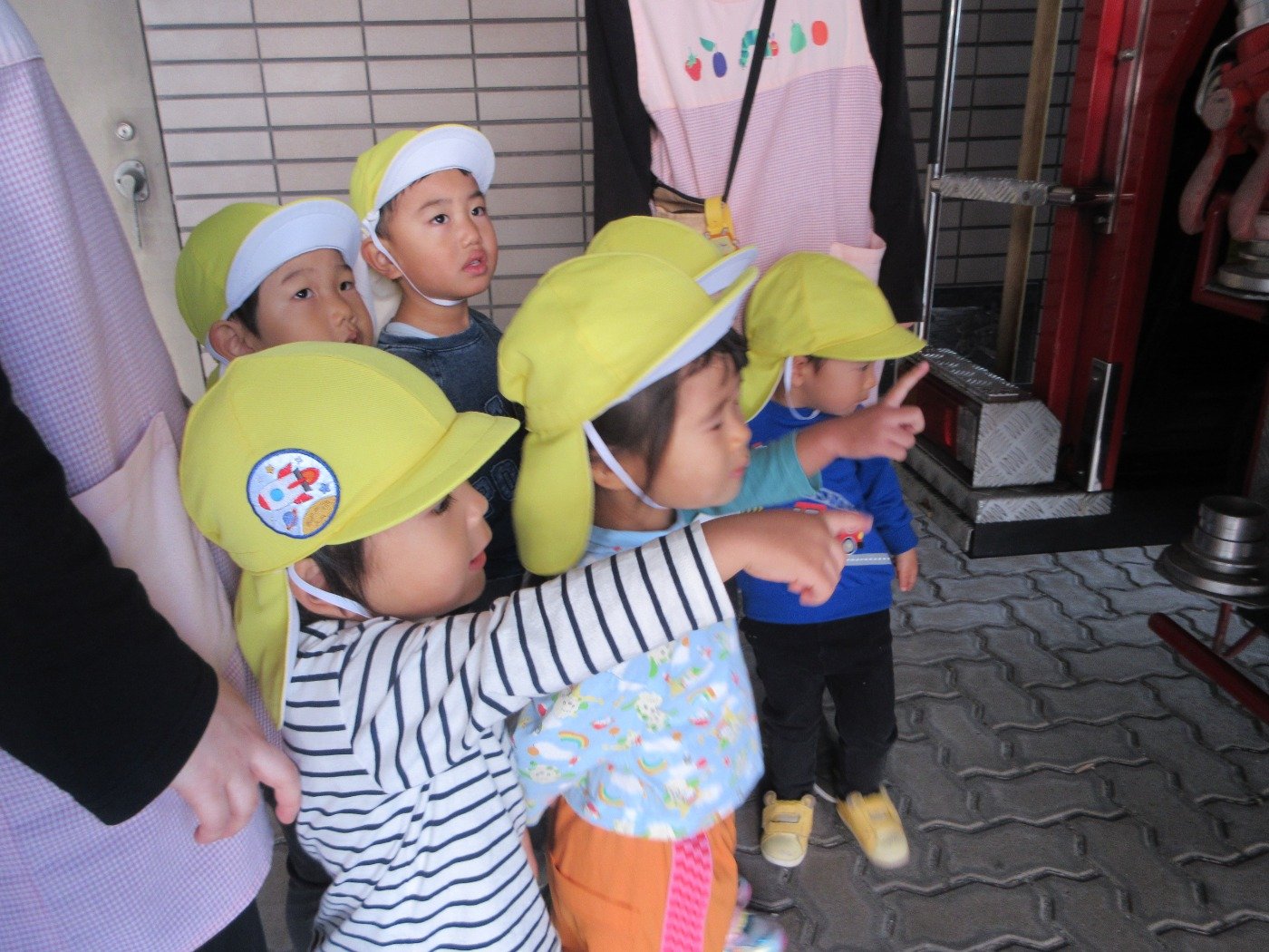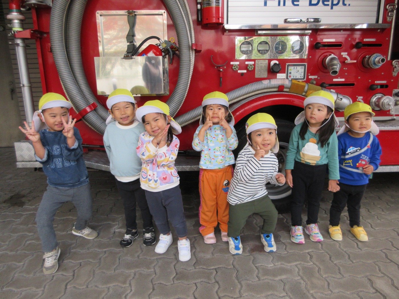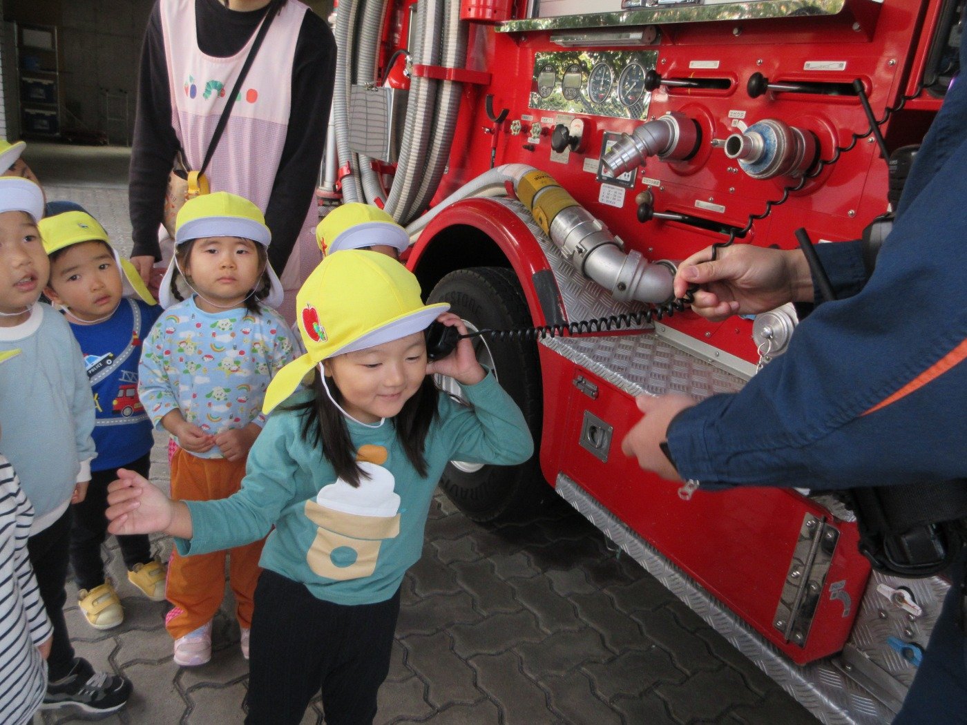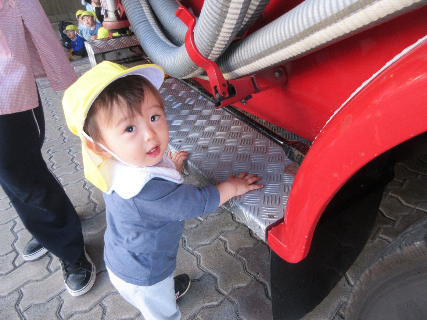 水消火器の練習や、消防車の見学に興味津々です。くま組さんは、消防車の色々な部品を