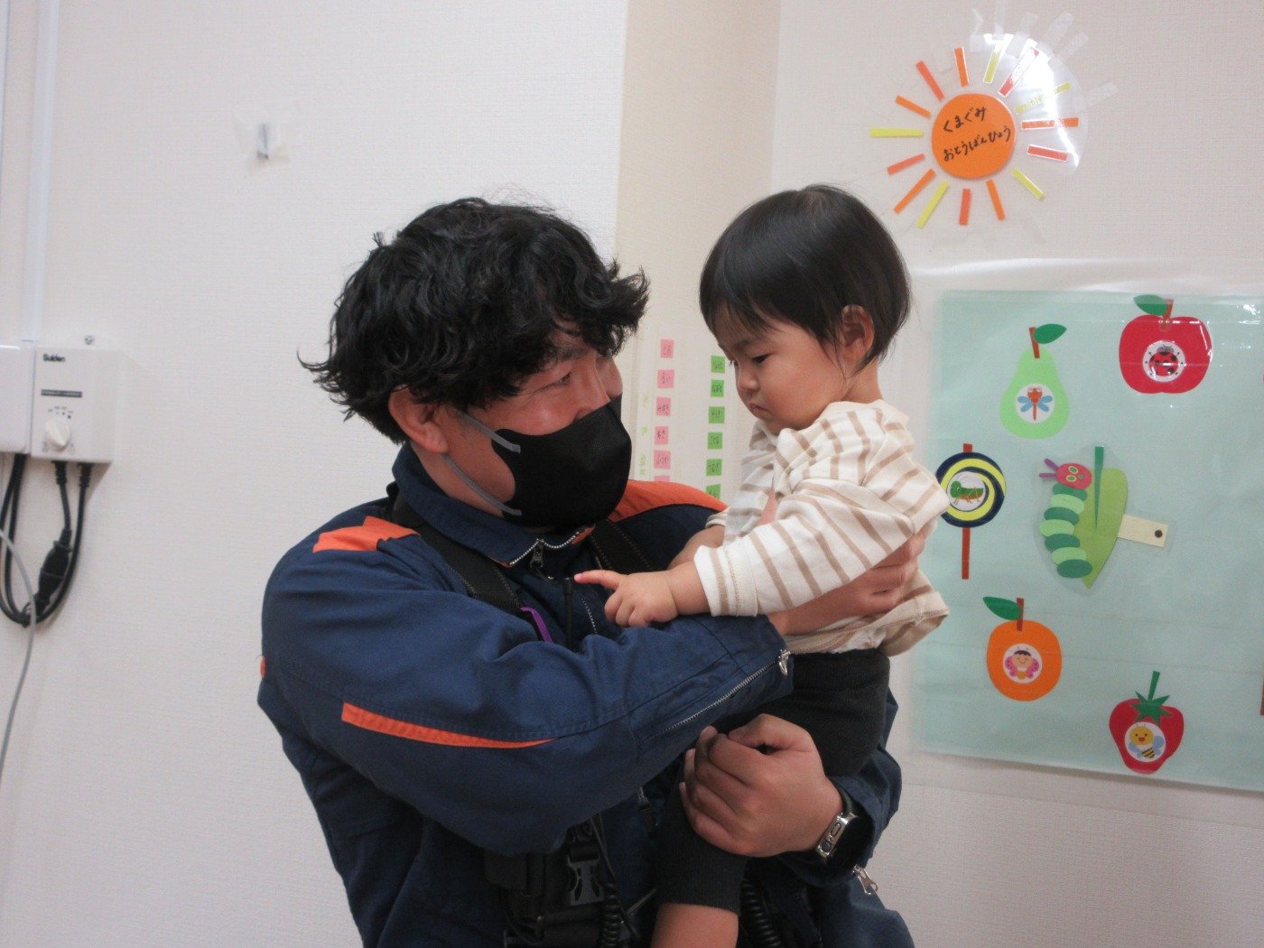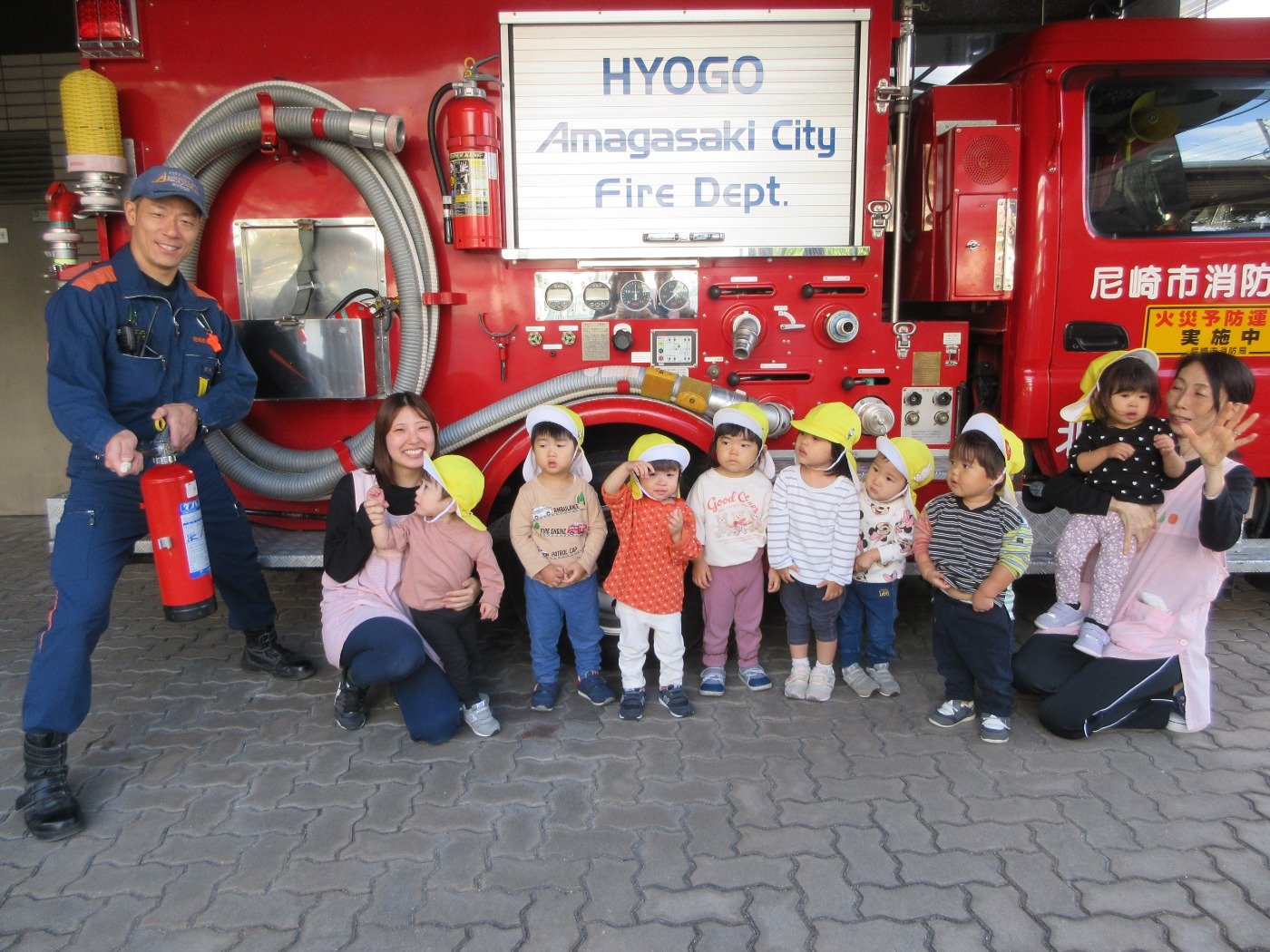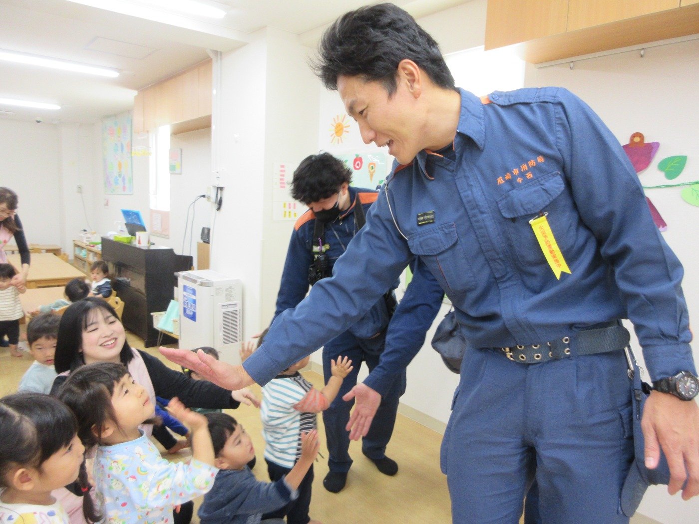 毎月実施している避難訓練!この日は消防車に乗って消防士さんがやってきてくれました。