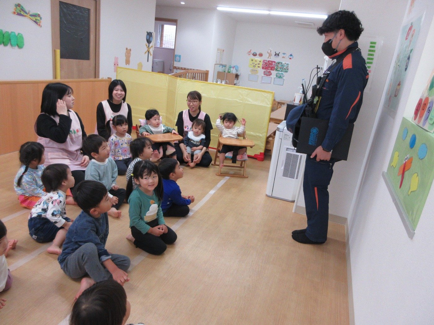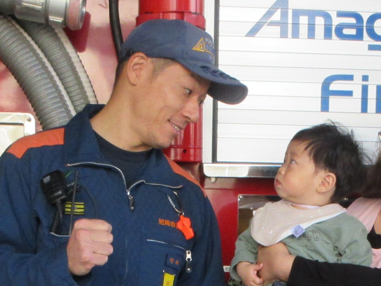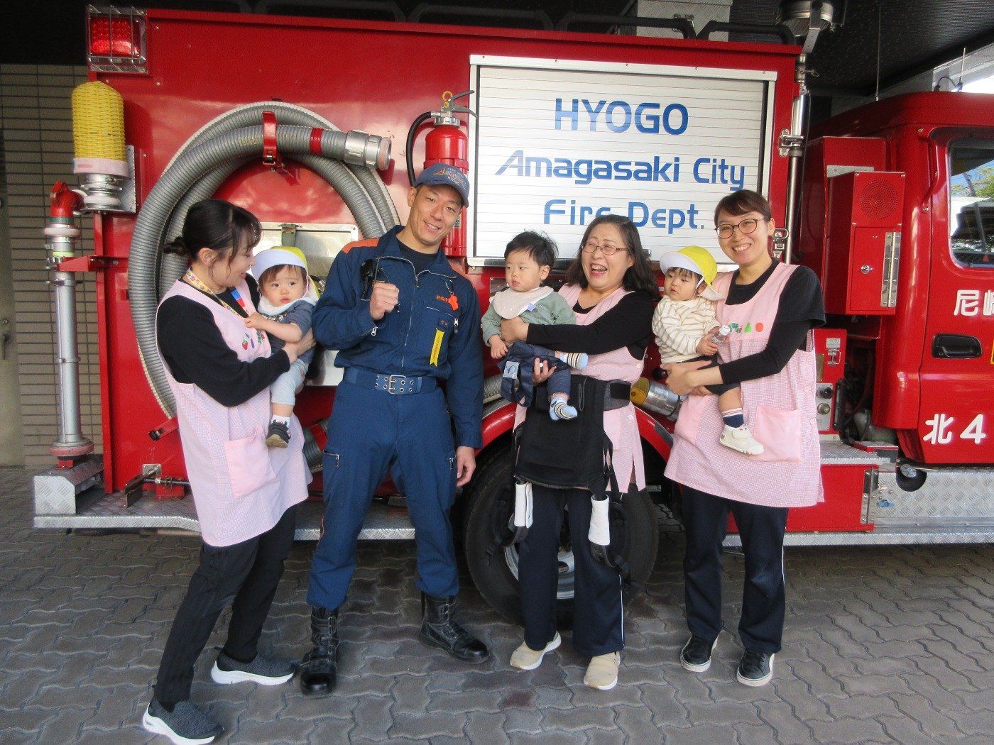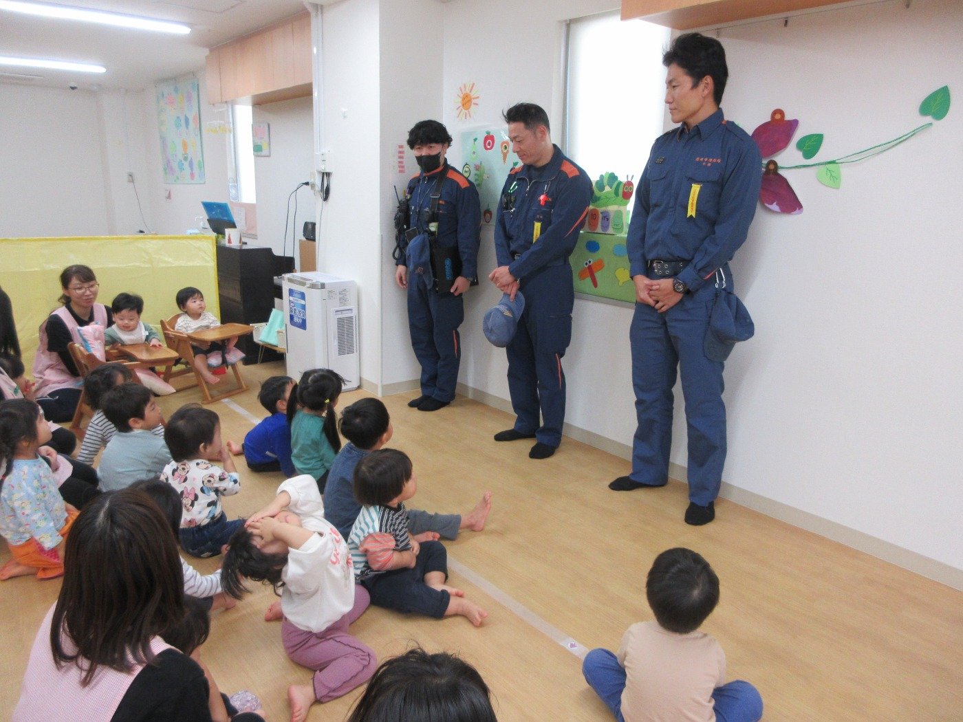 毎月実施している避難訓練!この日は消防車に乗って消防士さんがやってきてくれました。
