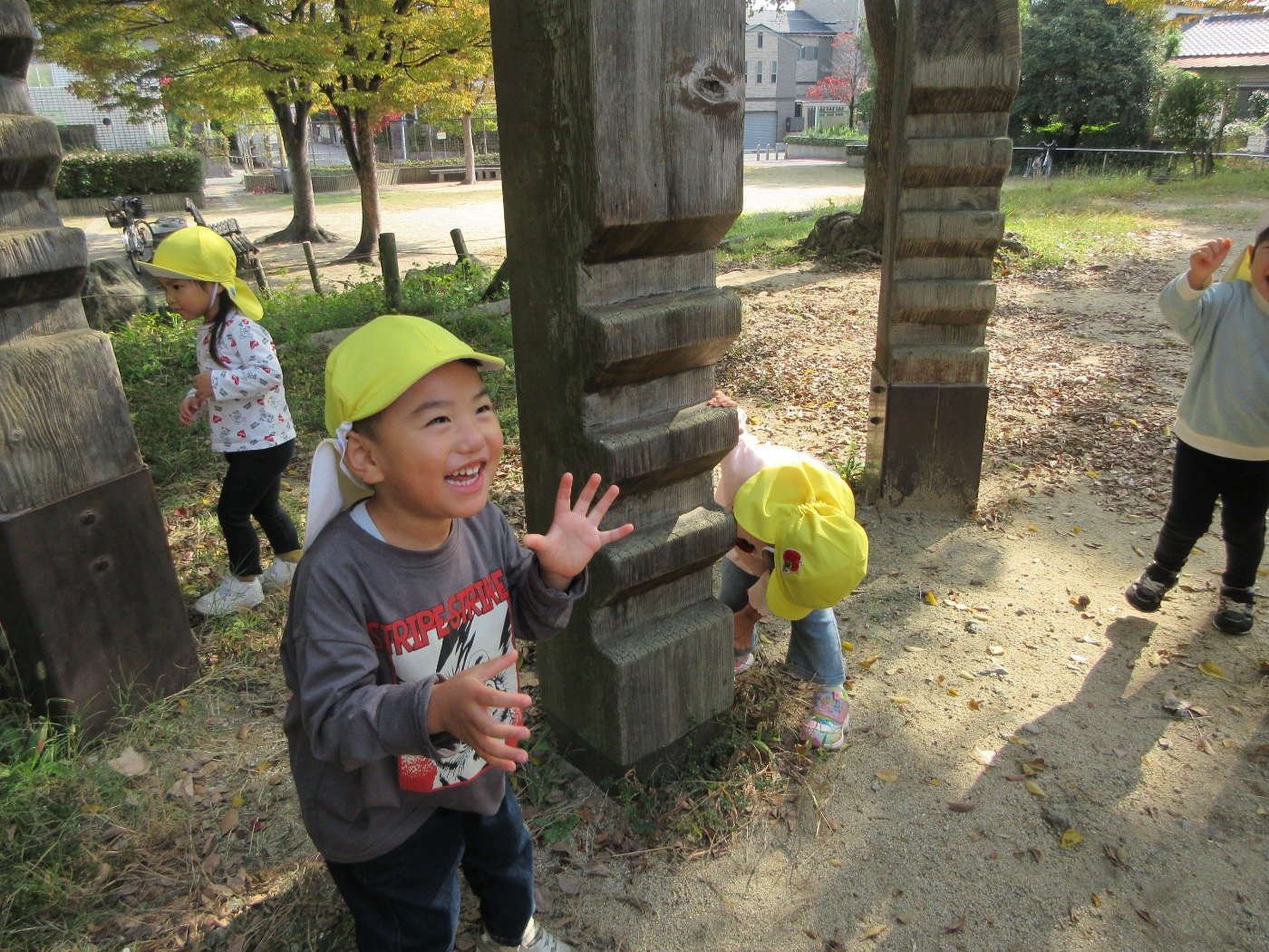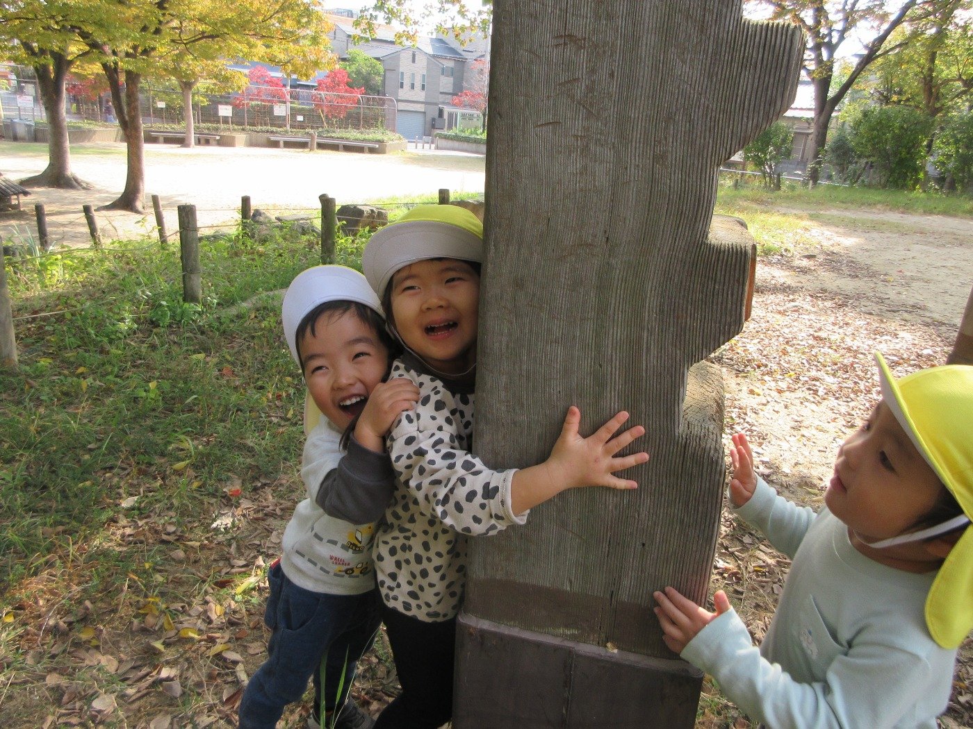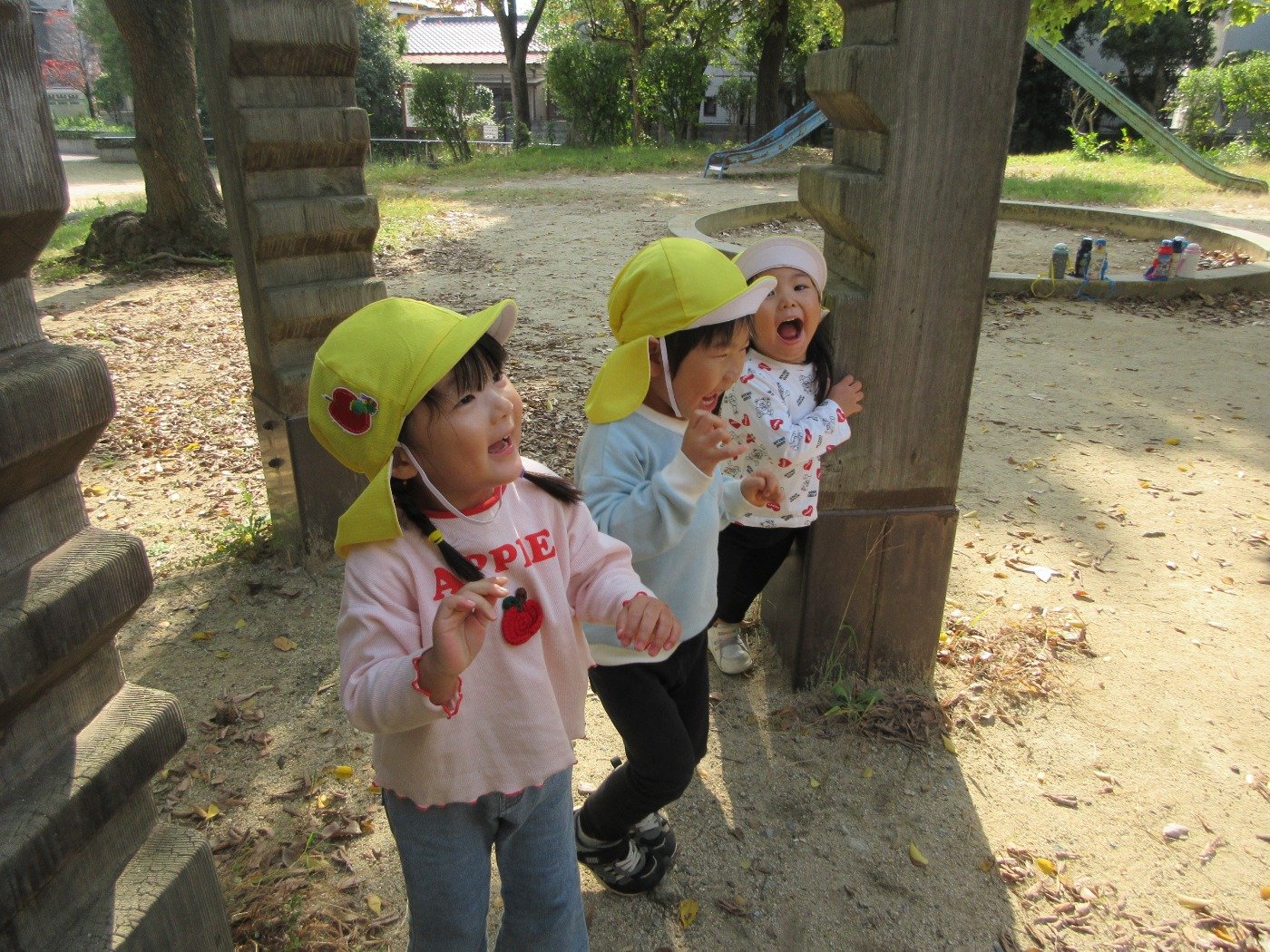 お友だちと一緒に柱の後ろに隠れて「バーッ!」大爆笑♪