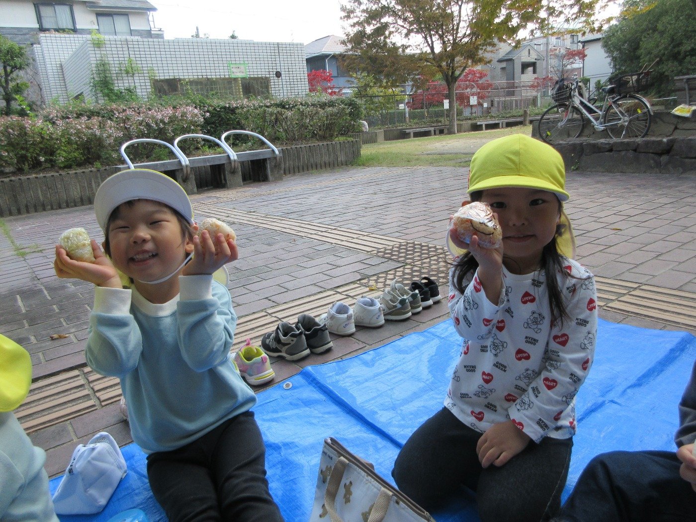 お家の人からの愛情たっぷりのおにぎりを嬉しそうに見せあいっこしながらパクパク