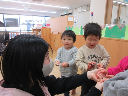 1月生まれは、3人のお友だちです。みんなからお誕生日の歌を歌ってもらったり、メッセージカードをもらってとっても嬉しそう♪「おめでとう!」って言われると心がポカポカするね。