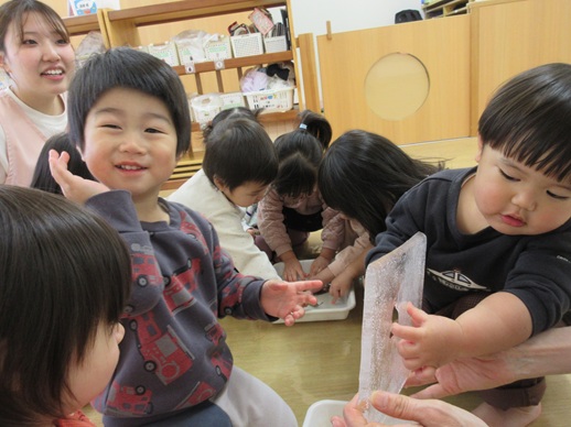 思い思いに氷の感触、冷たさを感じて楽しんでいました。氷の中から出てきたドングリも、とっても冷たかったね♪まだまだ続く寒い冬ですが、お外で風の冷たさや吐く息の白さを感じながら元気いっぱい過ごしていきたいと思います。
