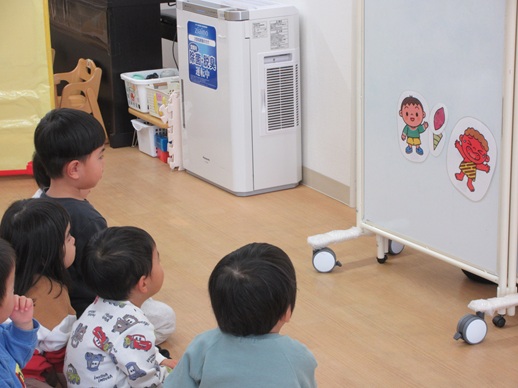 可愛い鬼さんが登場するシアターを見たり、「鬼が苦手なものはイワシを焼く匂いと、とげとげの葉っぱのヒイラギなんだってー!」と節分のお話を興味津々で聞いていました。