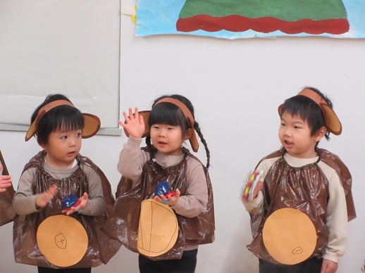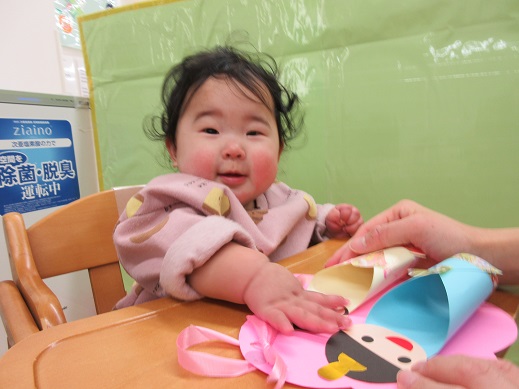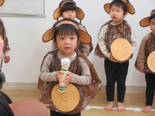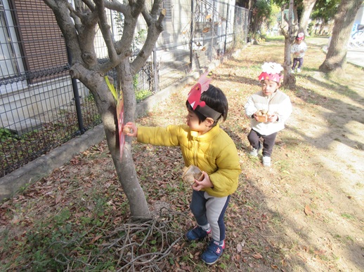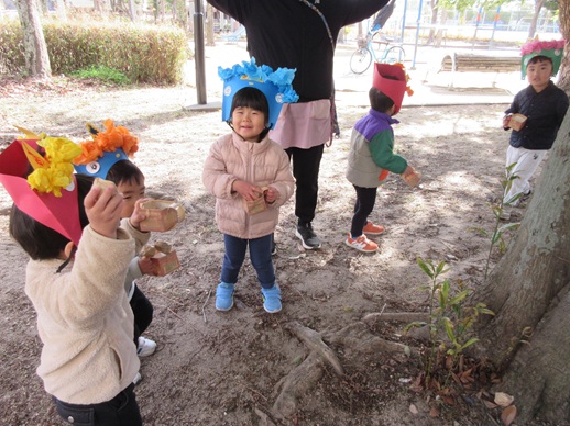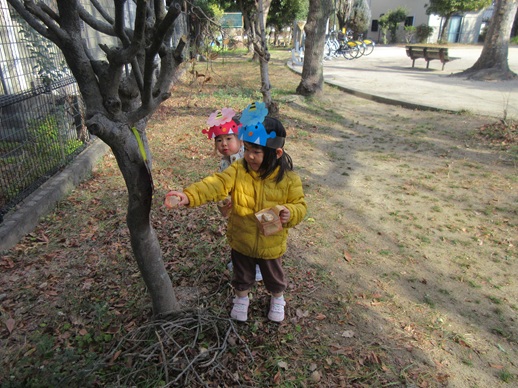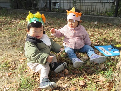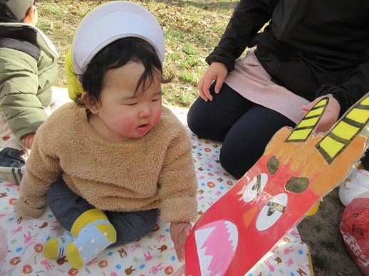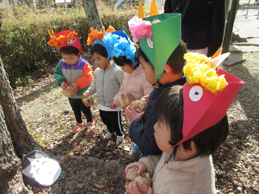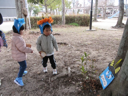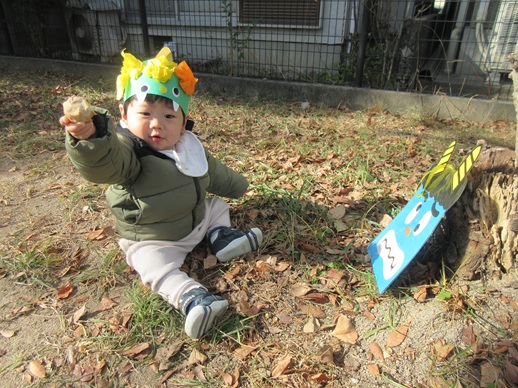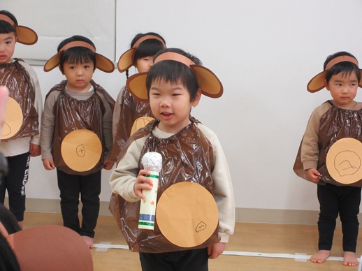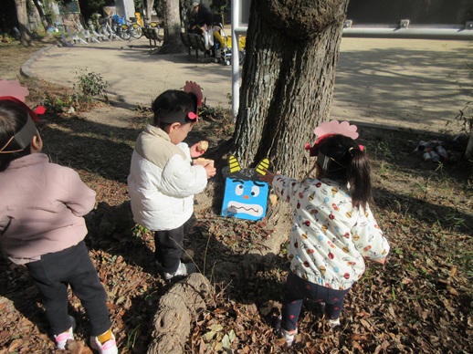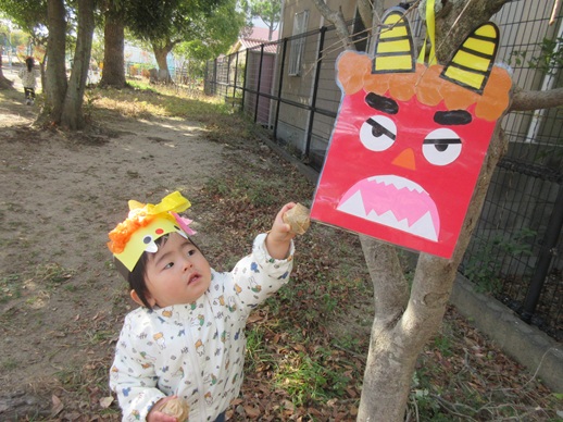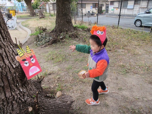 ひよこ組さんは鬼を見つけて「はい!どうぞ」と豆を食べさせてあげたり、お友だちに葉っぱをプレゼントしたり?…鬼退治とはほど遠い、可愛くてほっこりする姿を見せてくれました。