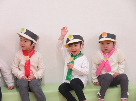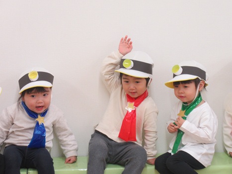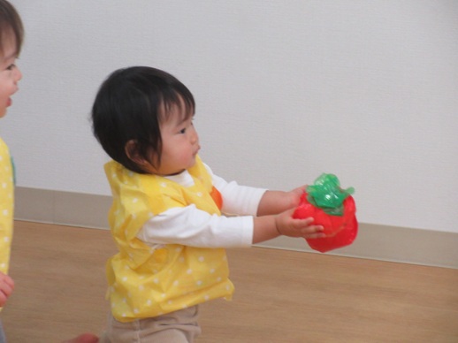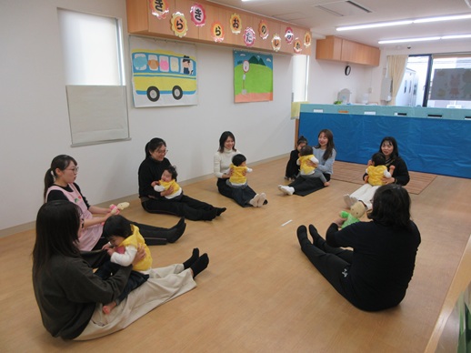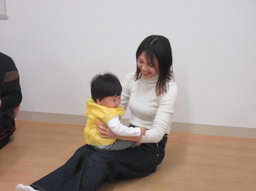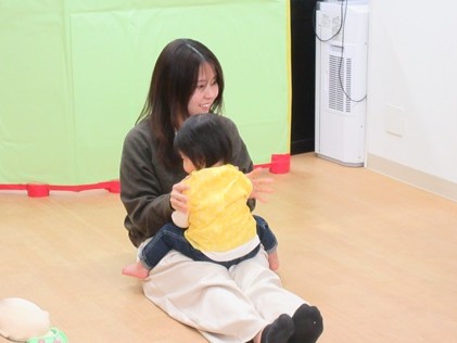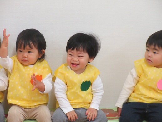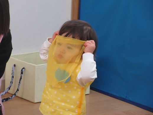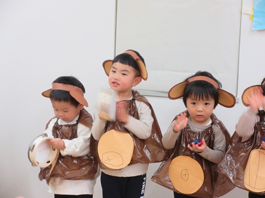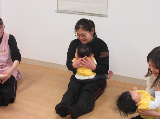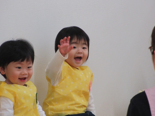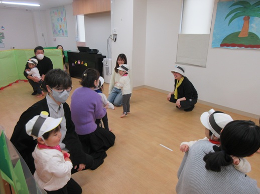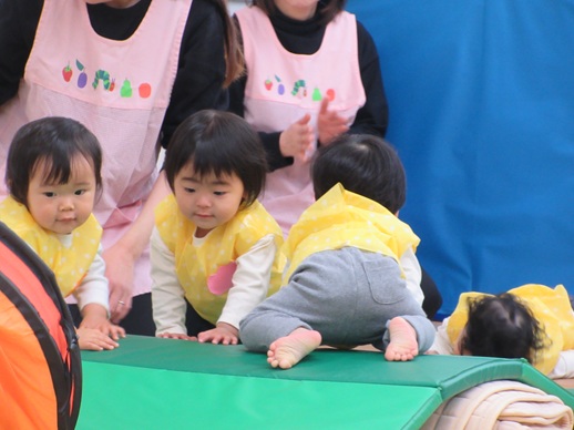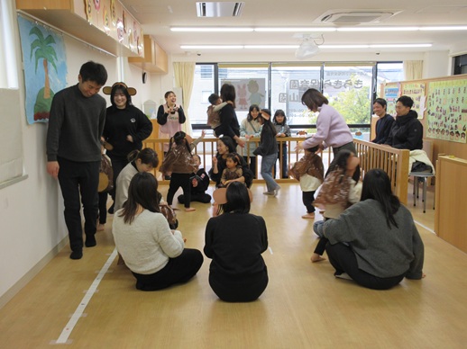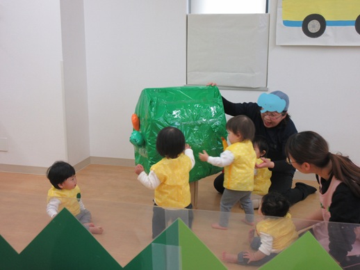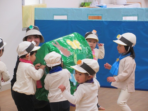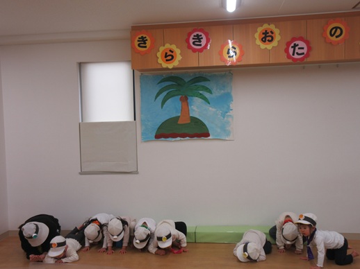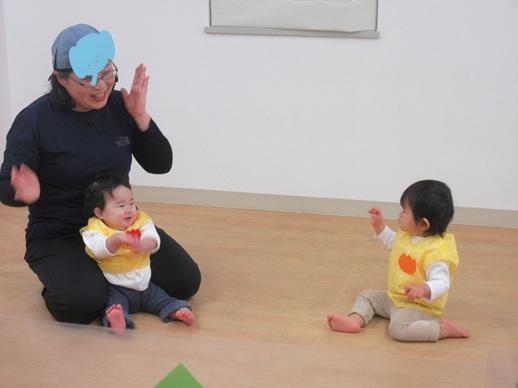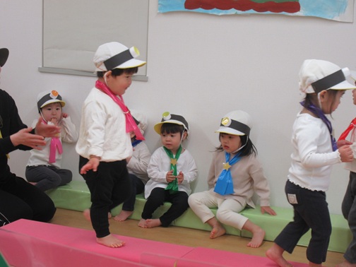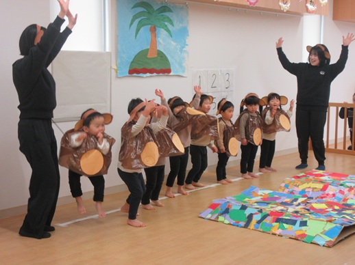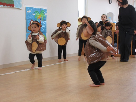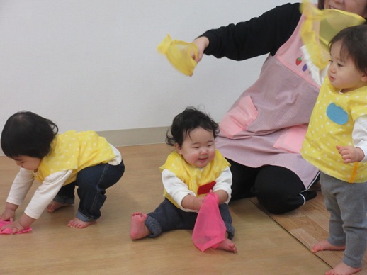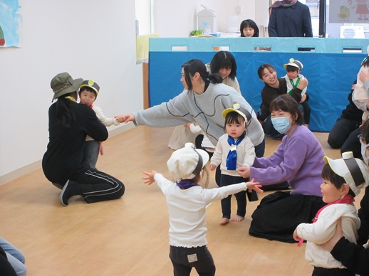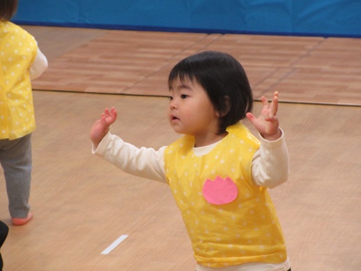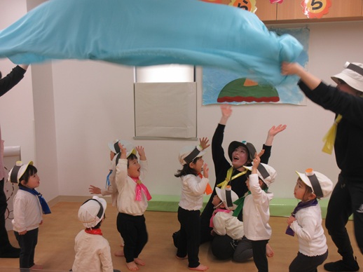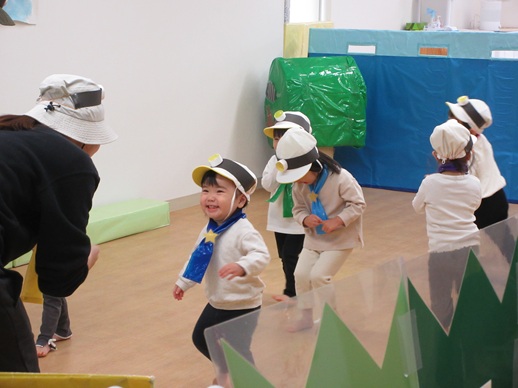 どんどん進むと…キャー!たいへん!大風が吹いてきました。最後にはみんな小さく丸まって、「だいじょうぶ?」の掛け声に「大丈夫でーす!」いつもの大好きな遊び。とっても可愛い表情をしてくれます♪