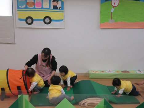 次にやってきたのは、いぬさん♪一緒にマットのお山を上ったり、トンネルをくぐったりして遊びました。いつの間にかしっかり歩けるようになったり、ハイハイもドンドン進めるようになり成長を感じます。