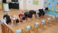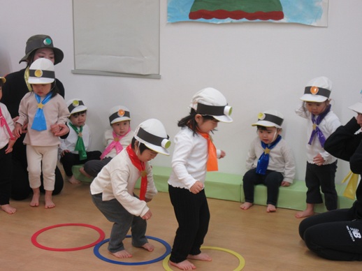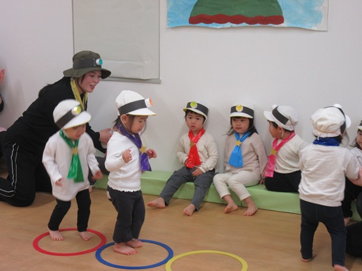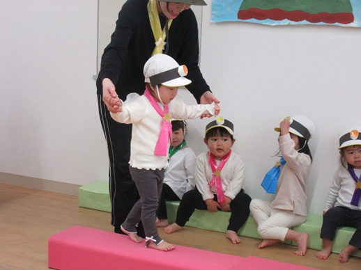 うさぎ組さんは、「森の探検隊ズコッ!」です。探検隊になって「しゅっぱーつしんこう!」「みんなそろっているかな?名前を呼ぶよ。」みんな上手にお返事できたね。森を進むと一本橋発見!そろーり歩いて渡ります。水たまりもありました。「みんなどうする?」「ジャンプジャンプ!」