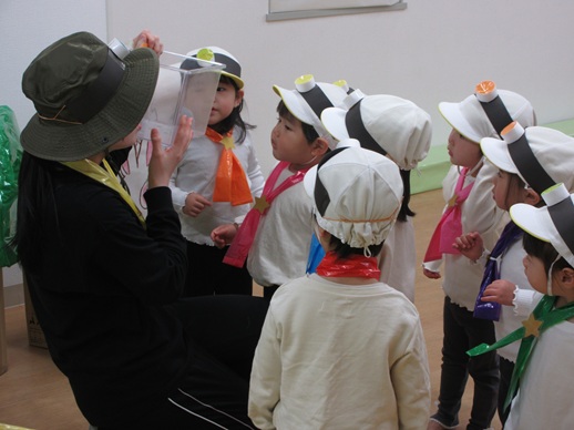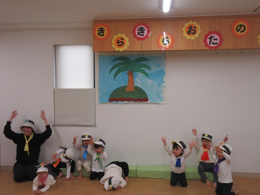 お宝のバナナを探したり、ロケットになったり、いつもの大好きな遊びが盛りだくさんです。最初緊張していたお友だちもいつしかいつもの調子が出てきて楽しんでいました。