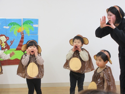 くま組さんは、「8匹のおさるの大冒険」です。まずは自己紹介!いつもは元気いっぱいお名前と好きな遊びを教えてくれるのですが…目の前にお家の人のお顔がズラリ…ドキドキしたね。緊張する姿も成長の証です。