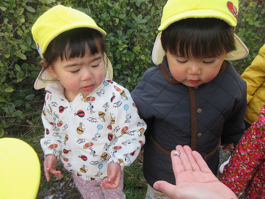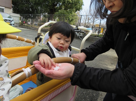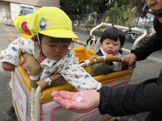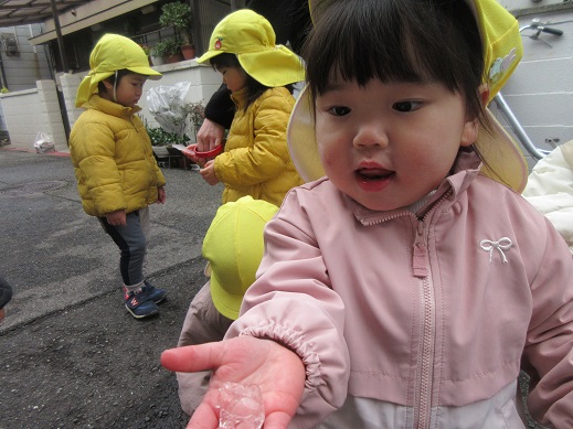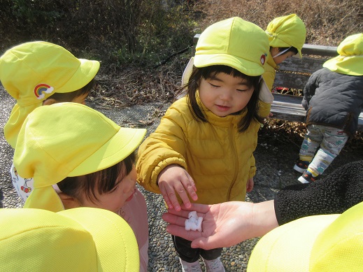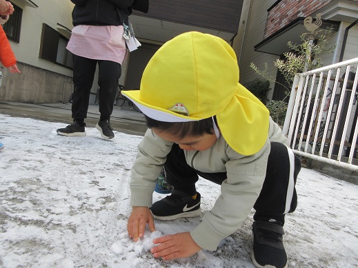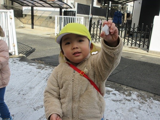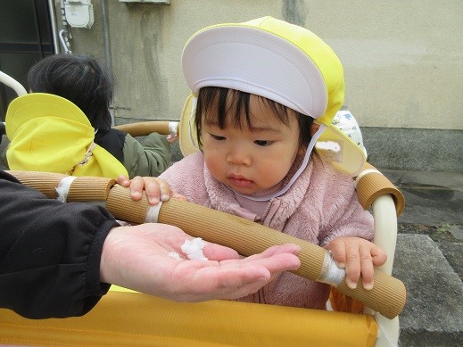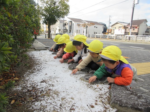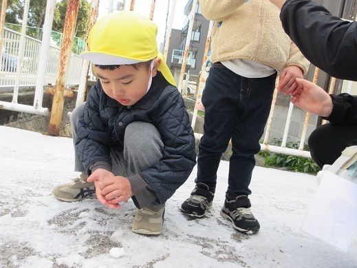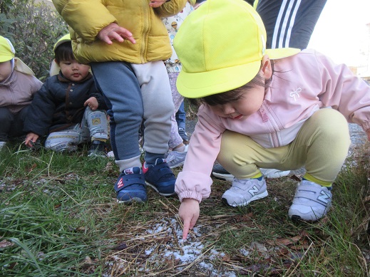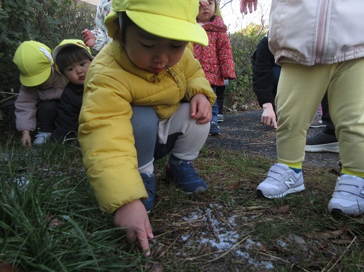 うさぎ組さんは、公園で雪探し♪ほとんど溶けてしまっていたけれど、ほんのちょっとの雪を見つけると「あったー!」ととっても嬉しそう。興味津々です。ひよこ組さんもお散歩の途中で見つけた雪に「これなんだろう?」じーっと見つめたり、触ってみたり…初めて出会う雪を体感しました。