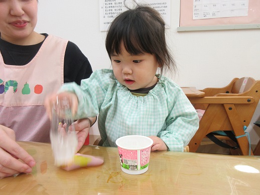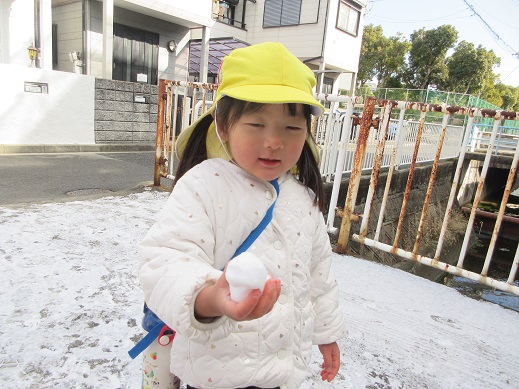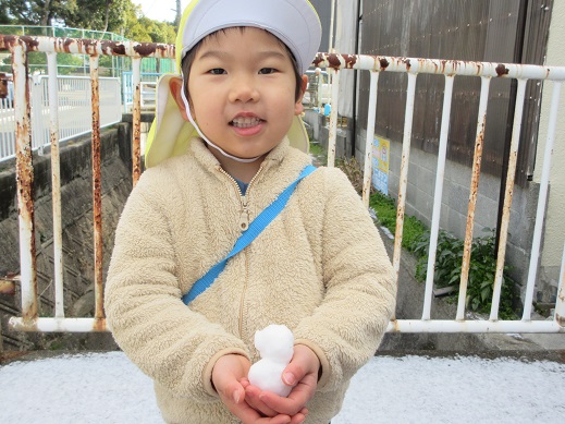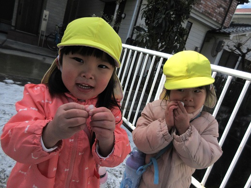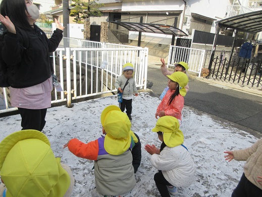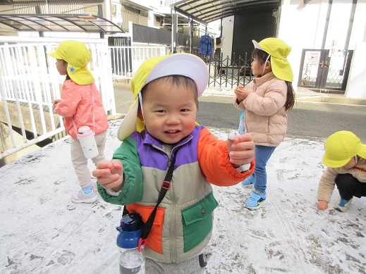 めったに降らない雪に出会えて良かったね。冷たい風を感じたり、走ってポカポカになったり…子どもたちは毎日様々なことを体感しています。春はもうすぐそこまできていますね。これからもお外でいっぱい遊ぼうね。