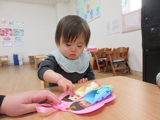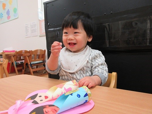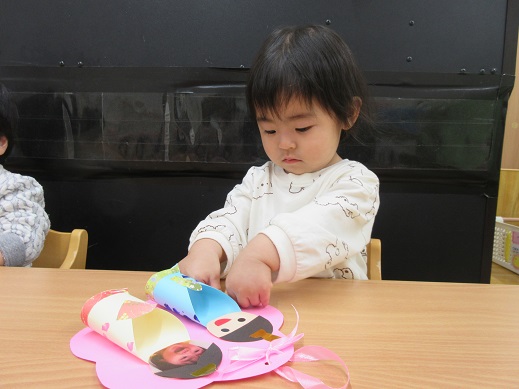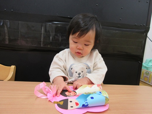 もうすぐひなまつり♪思い思いのひな人形を作りました。ひよこ組さんは、絵の具で着物の模様をスタンプして、最後の仕上げにシールをペタペタ。お雛様やお内裏様の横には子どもたちのお顔があります。「これだーれだ?」と聞くと指をさして教えてくれました。お名前を呼べるようになったお友だちもいて、成長を感じます。大きくなったね。