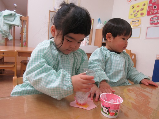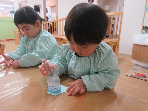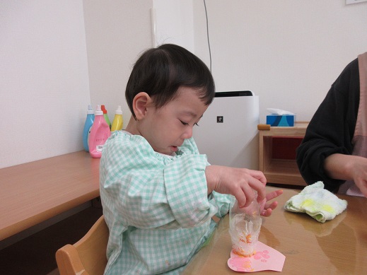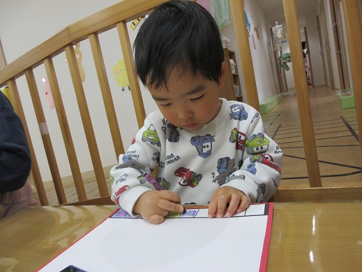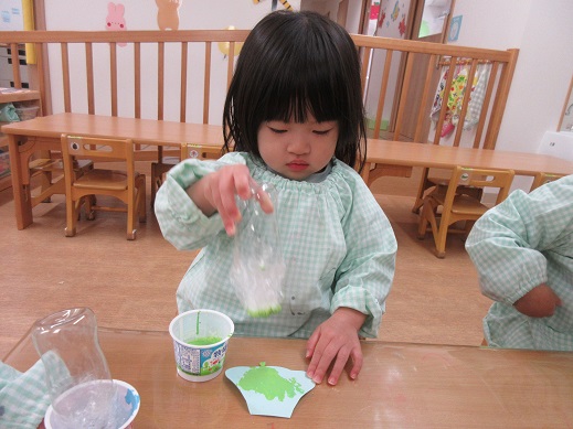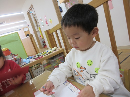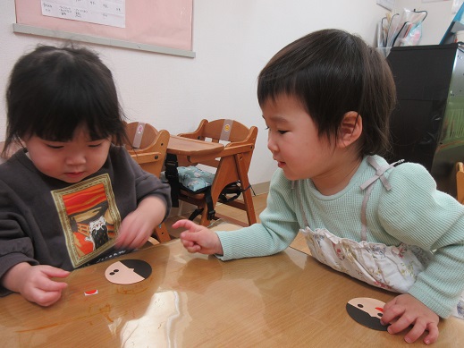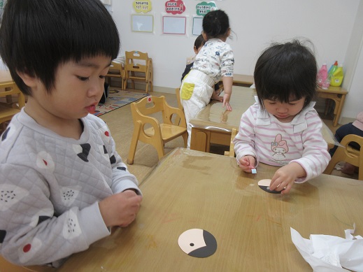 うさぎ組さんは、お顔のシールを自分で貼りました。頭の上におめめがあったり、ほっぺにお口があったり個性豊かなお雛様お内裏様です。着物はスタンプで♪絵具をつけてそーっとそーっと…きれいな模様ができました。