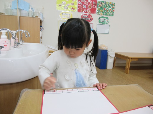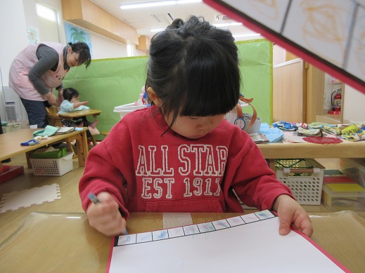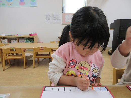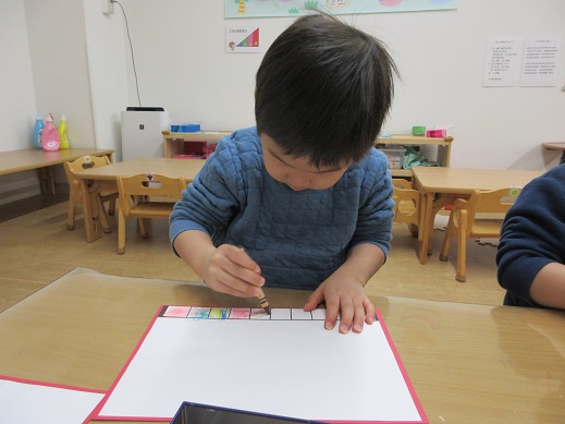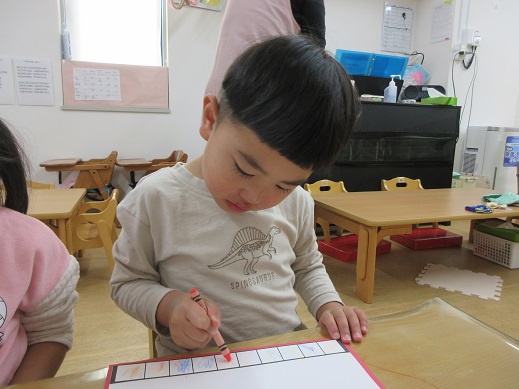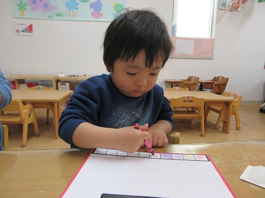 くま組さんは、まずはお雛様お内裏様が座る台の模様をクレパスで色付けしました。いくつも並んだ四角にひとつひとつ色を変えながら塗っていきます。みんな集中して真剣な表情。