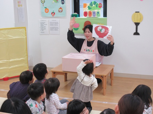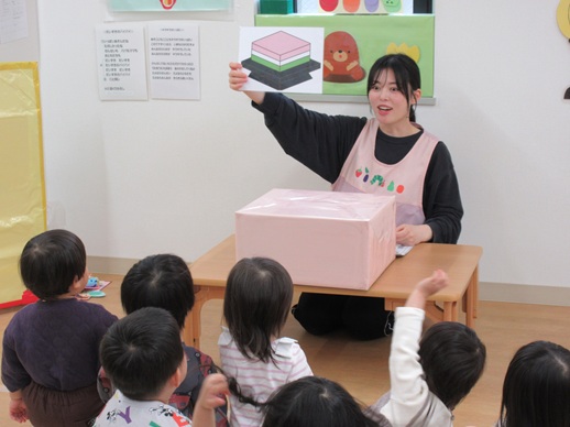 「ひしもちと鏡餅、おひなさまに飾るのはどっちだ?」鏡餅の方に手を挙げるお友だちもチラホラ…(笑)「ひなまつりの日に頂くお吸い物は?ハマグリ?栗?」この問題はほとんど正解!みんな張り切って答えてくれました。ひしもちの色には意味があるんだって。元気に過ごせますようにって願いが込められているんだよ。みんな真剣な表情で聞いていました。