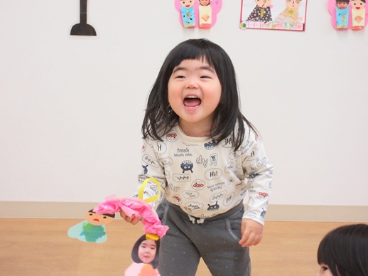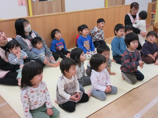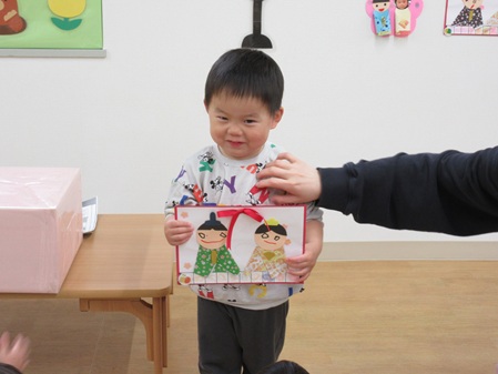 自分たちで作ったおひなさまの紹介もしてくれました♪みんなの前に出てきて照れ笑い。くま組さん、うさぎ組さん、ひよこ組さん、それぞれ可愛いひな人形ができましたね。