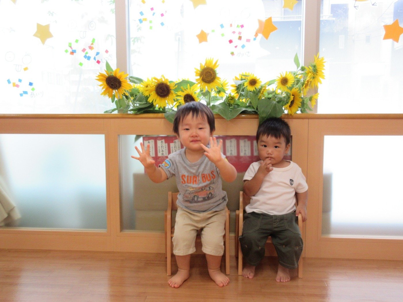 ひまわり畑に行った職員が子ども達に生花のプレゼント。窓いっぱいのひまわりに子ども達は花びらに触れたり、大喜び!
