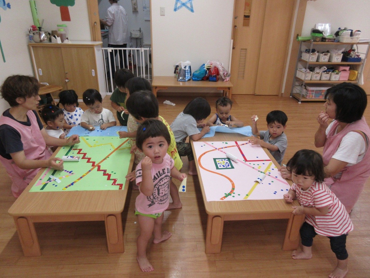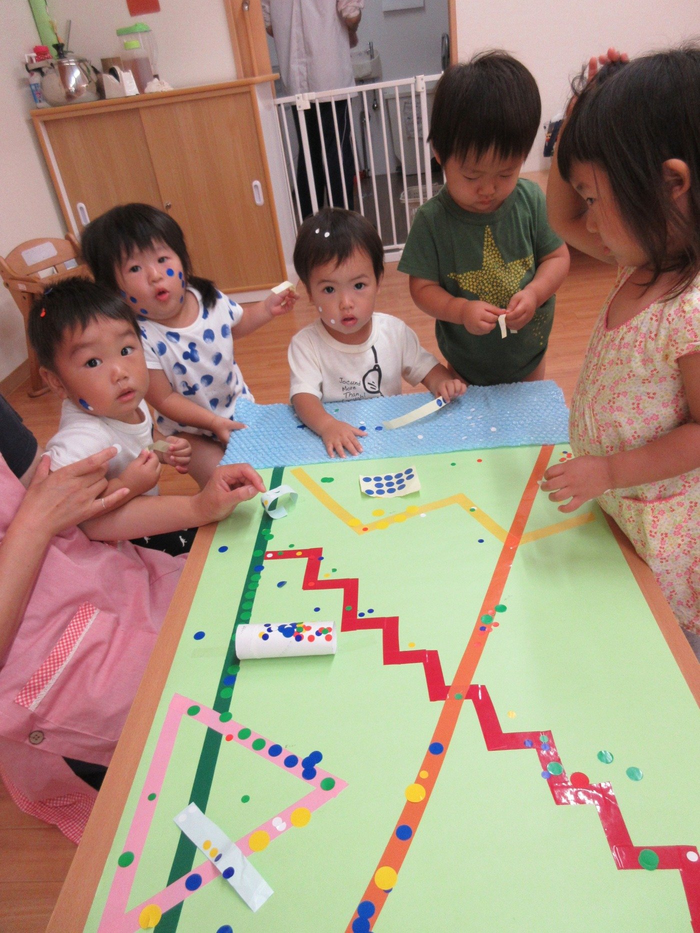 シーンとするほどすごい集中力!手についたシールに格闘する子どももいますが、楽しみながら素敵な作品が出来ました。