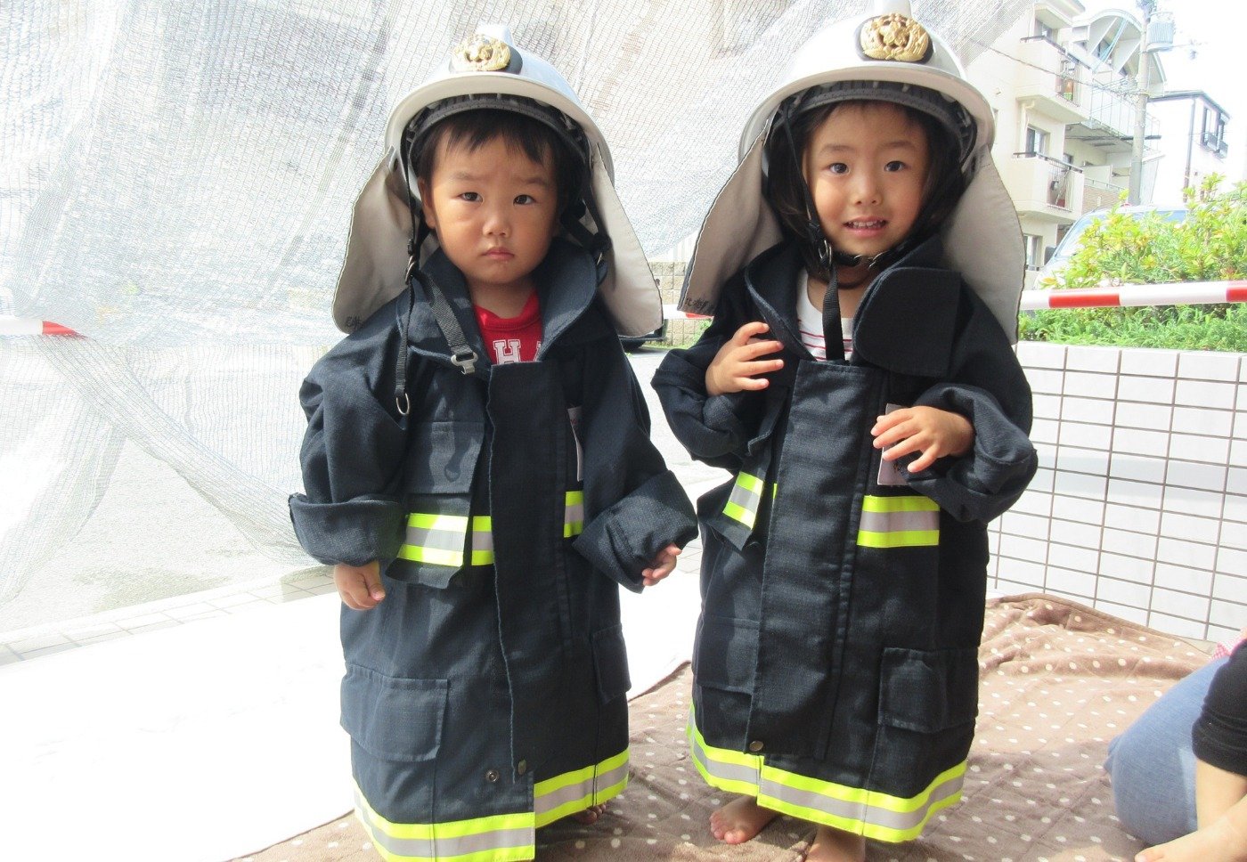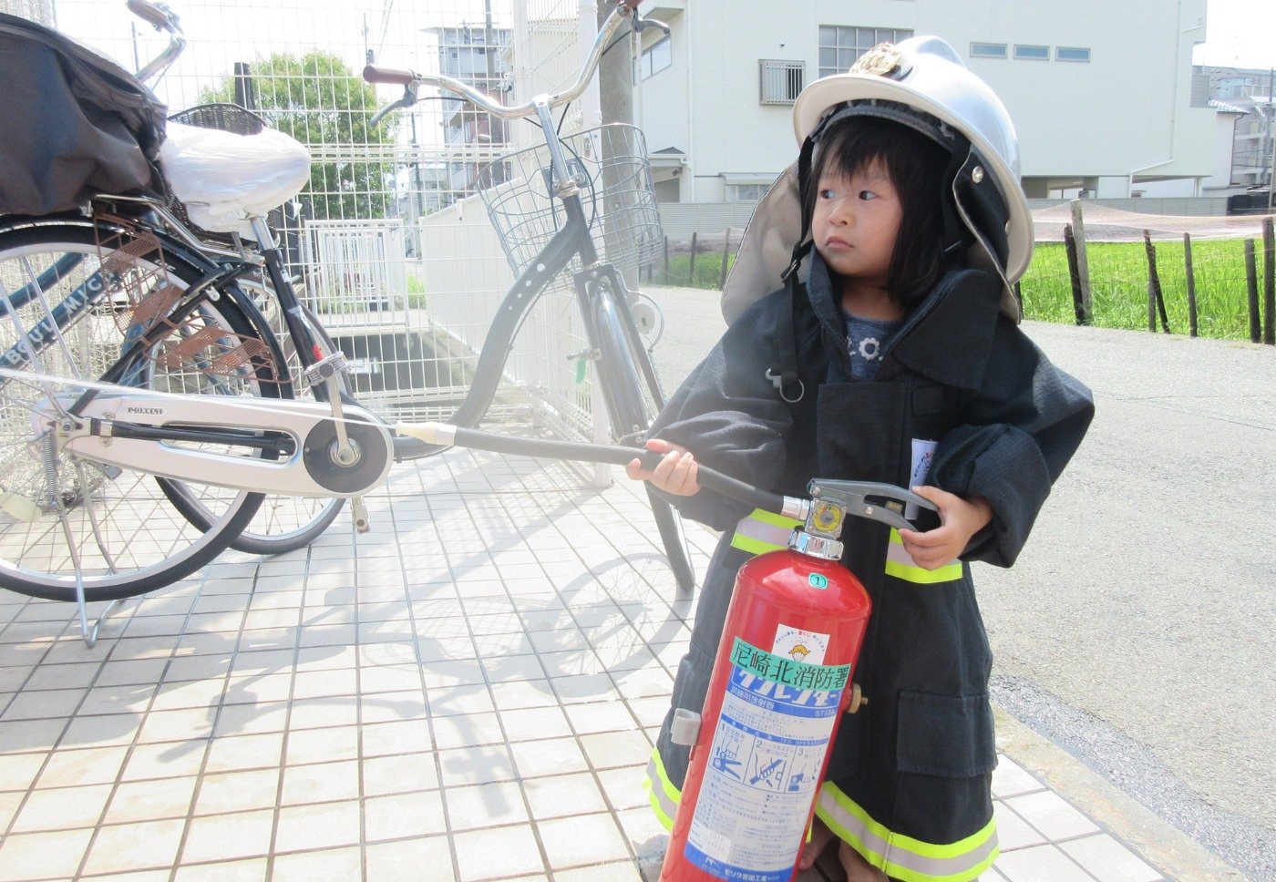 かっこいい消防士さんになりきり体験に大喜びでした。