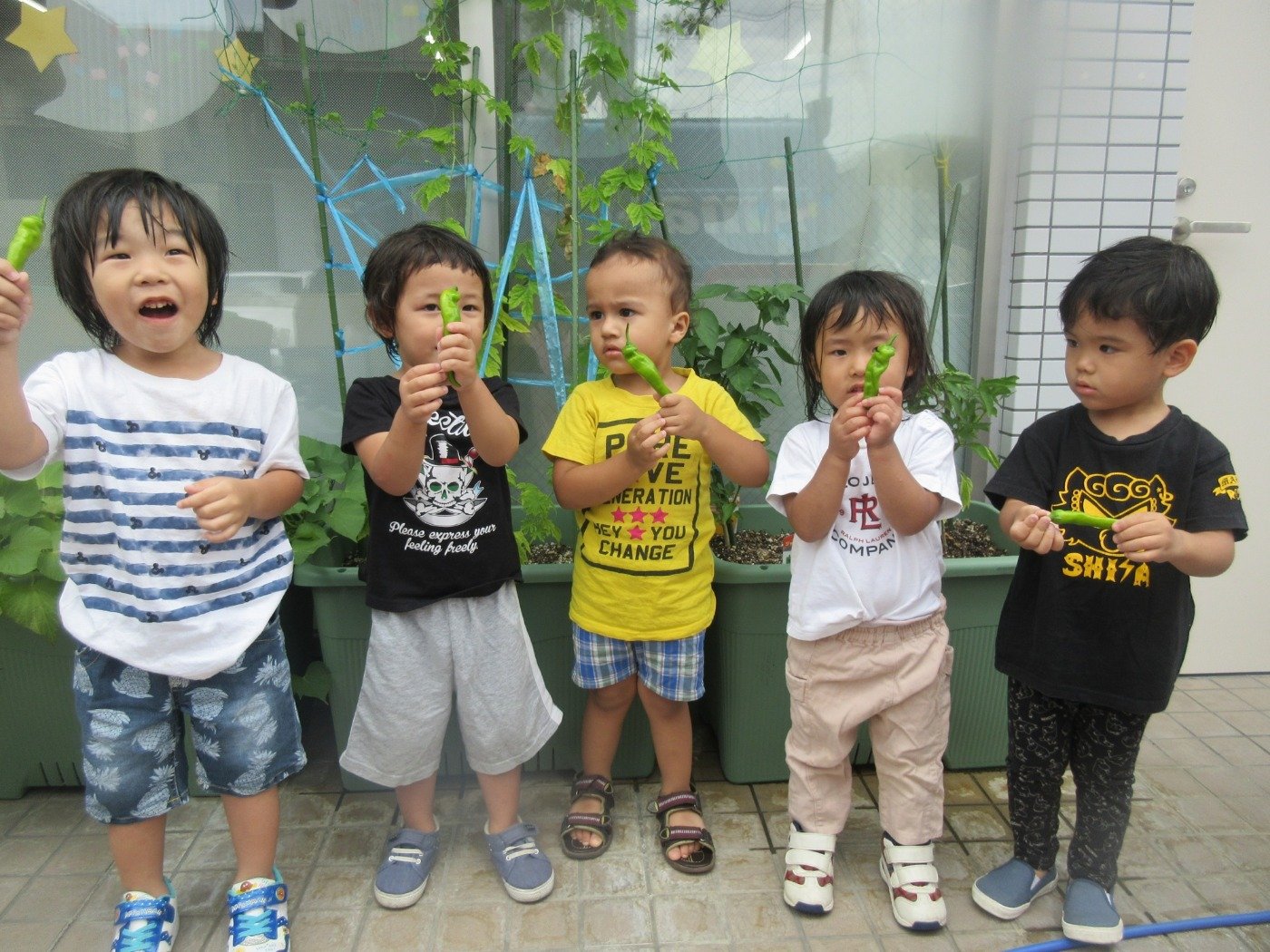 園で育てたピーマンが、2歳児 くま組さんの人数分5個実りました。