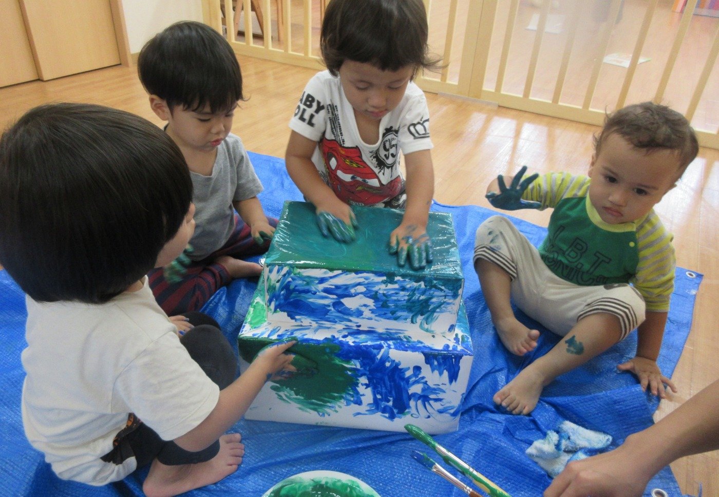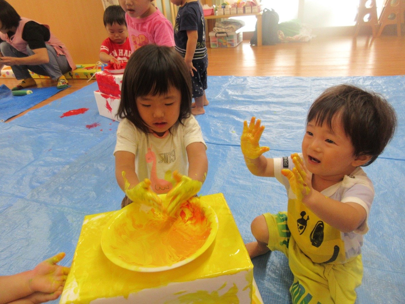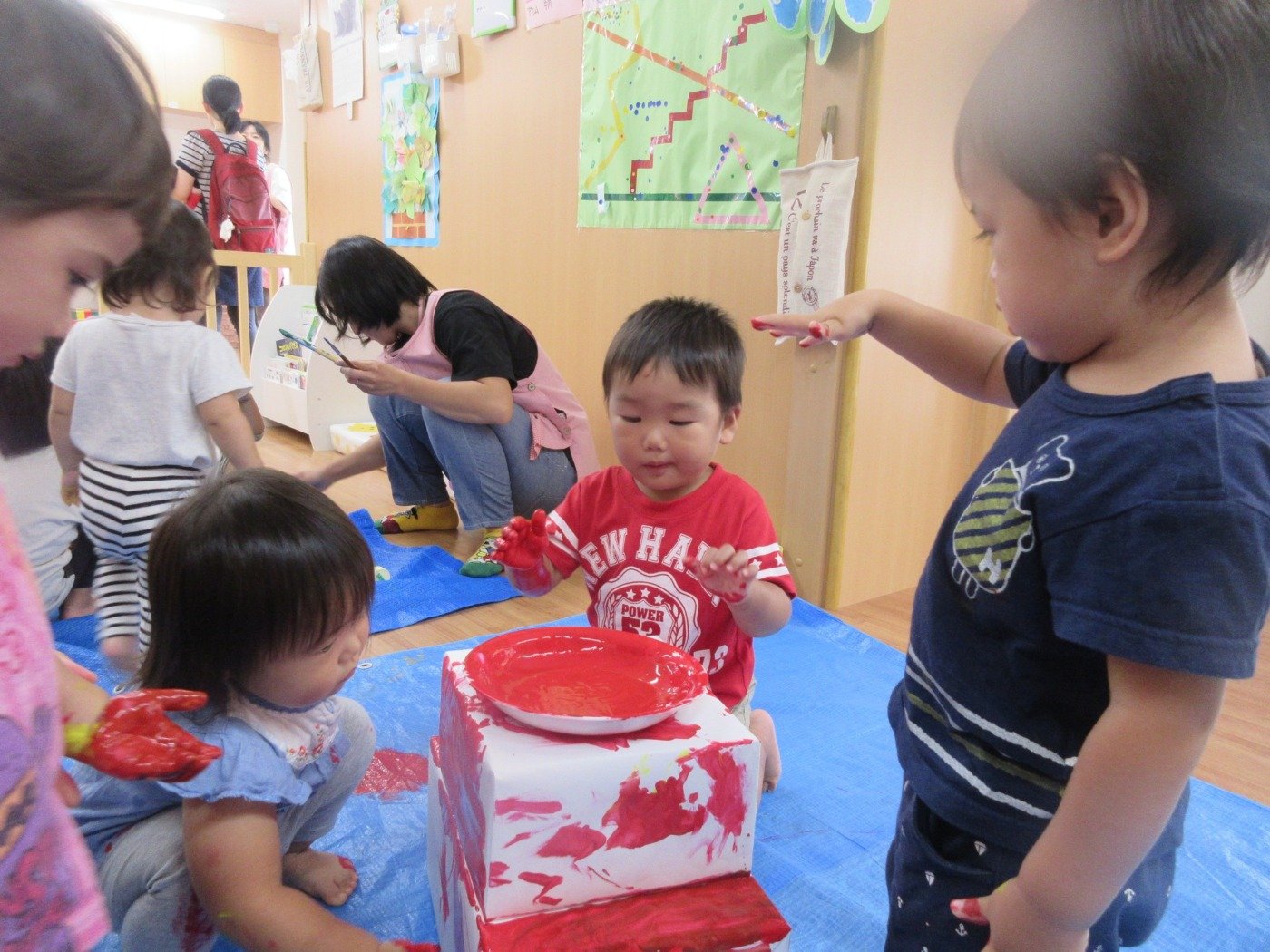 16日(土)の「きらきらまつり」に向けて、絵具で塗り塗り、シールや折り紙をペタペタ…