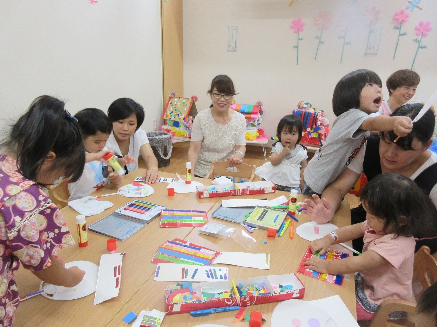 うちわにペタペタと○△□など色々な形を貼って、素敵なうちわを作ったね。