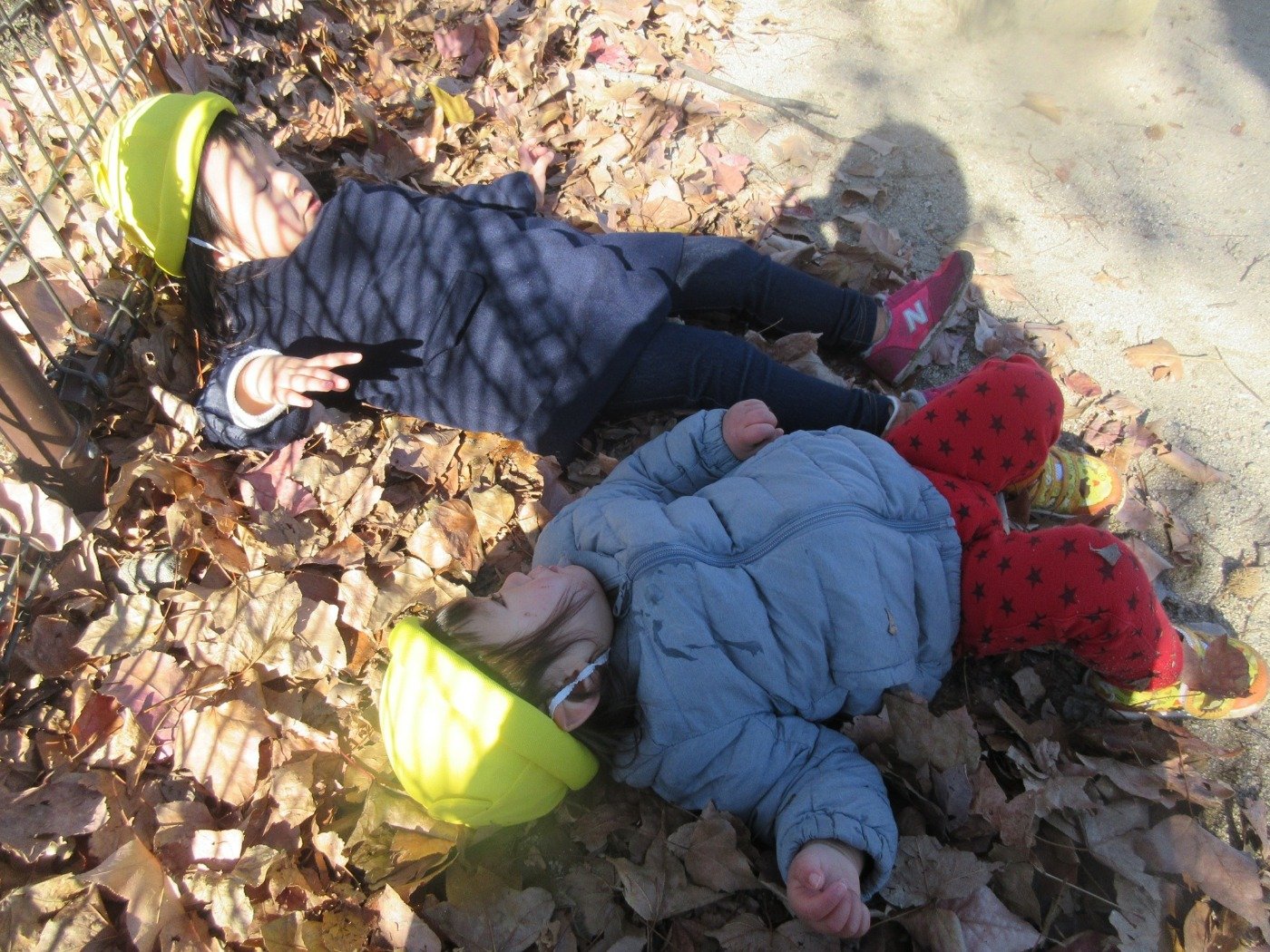 枯葉の布団でゴロゴロと転がって遊ぶ子…
