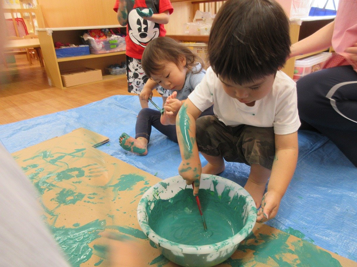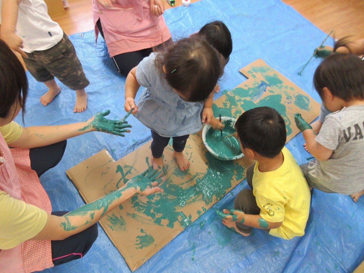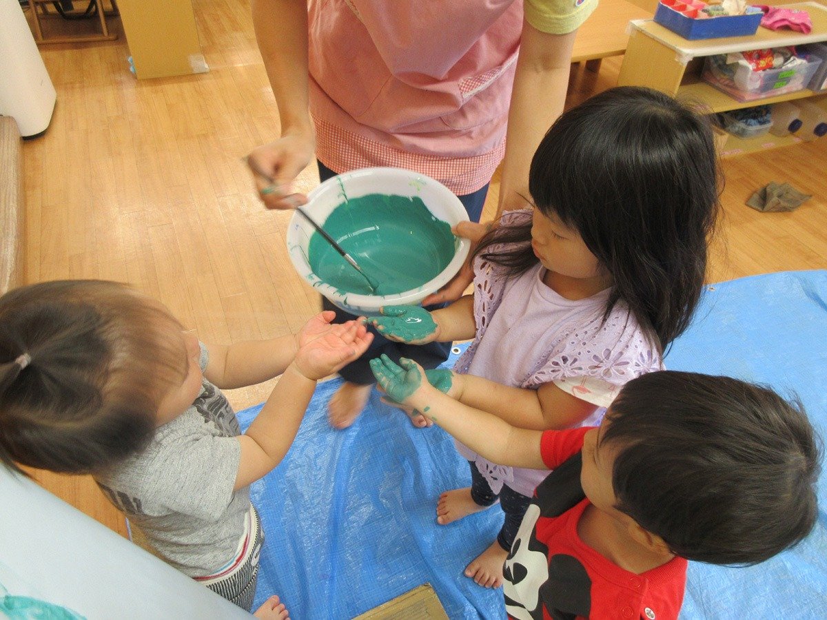 手のひらにたっぷり絵の具をのせてもらって「どばーーーっ!!」と言いながら