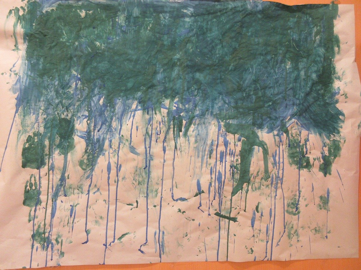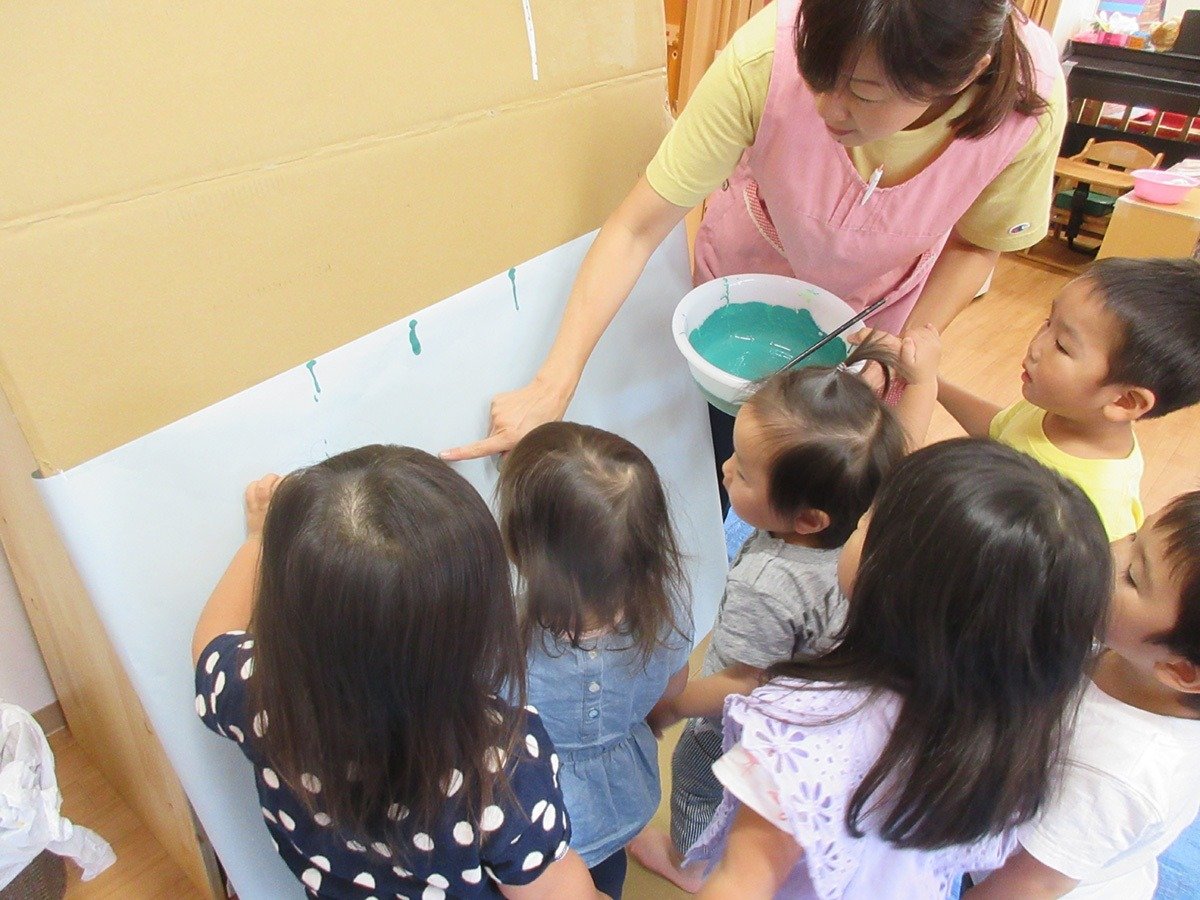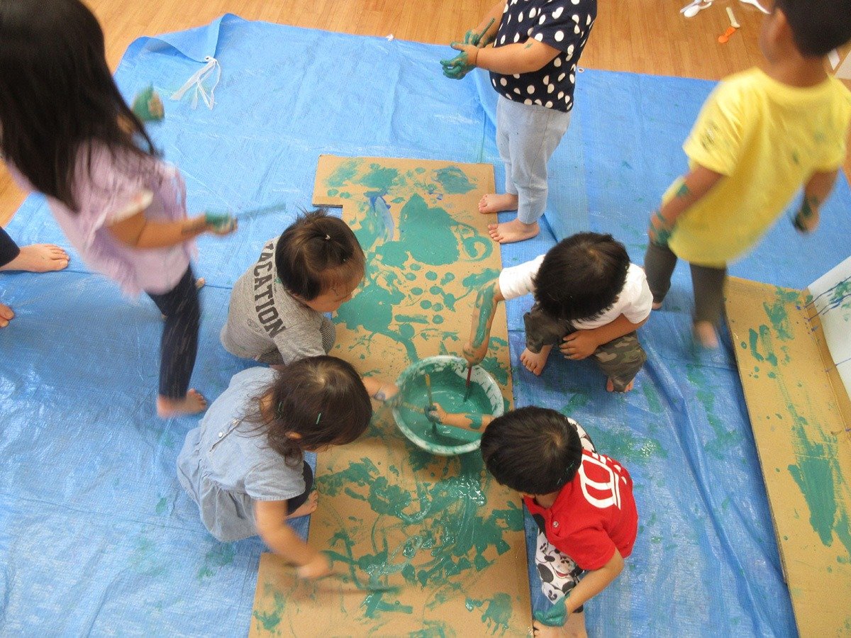 手のひらにたっぷり絵の具をのせてもらって「どばーーーっ!!」と言いながら