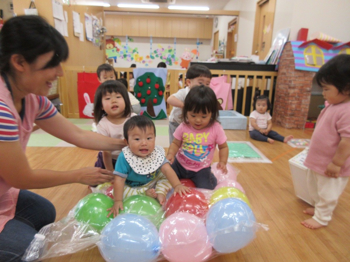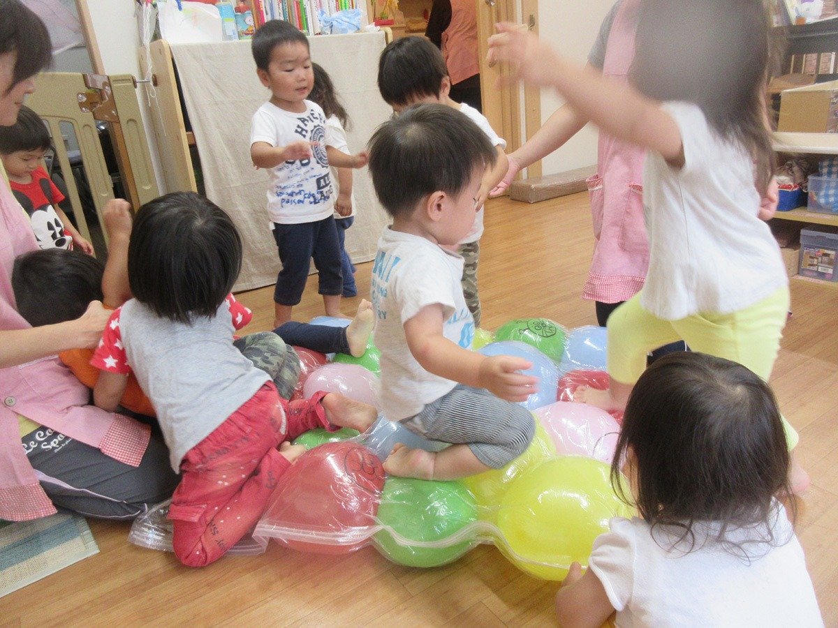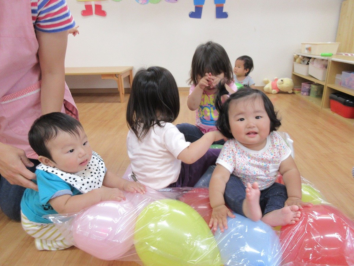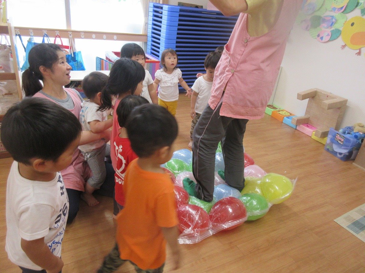 0歳児のお友達も ふかふかの風船マットに揺られて