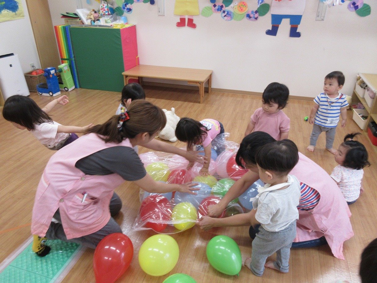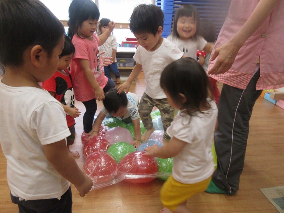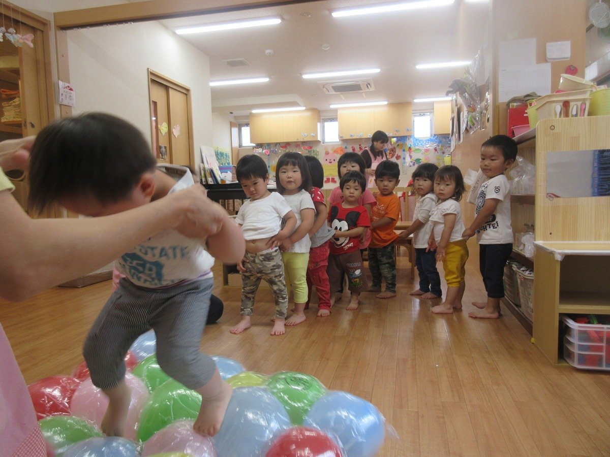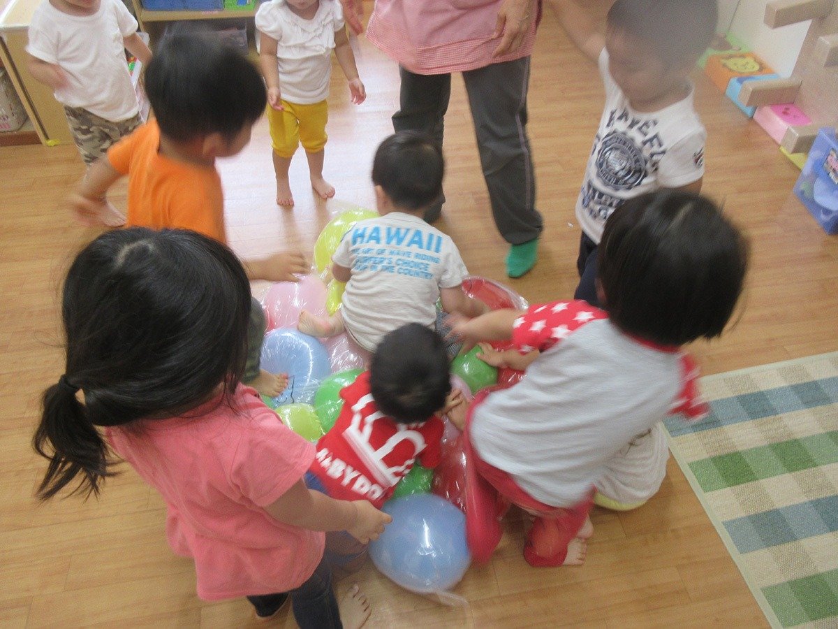 0歳児のお友達も ふかふかの風船マットに揺られて