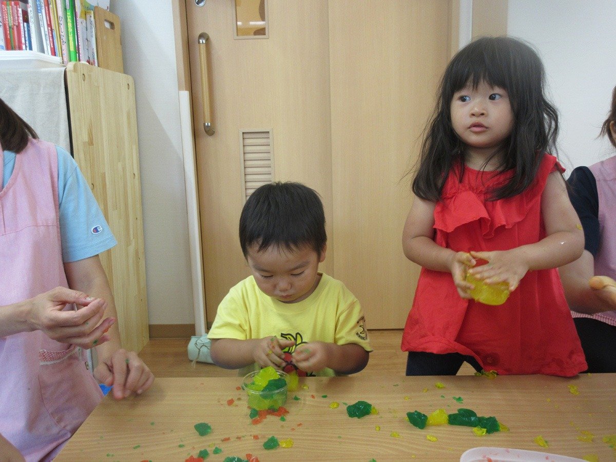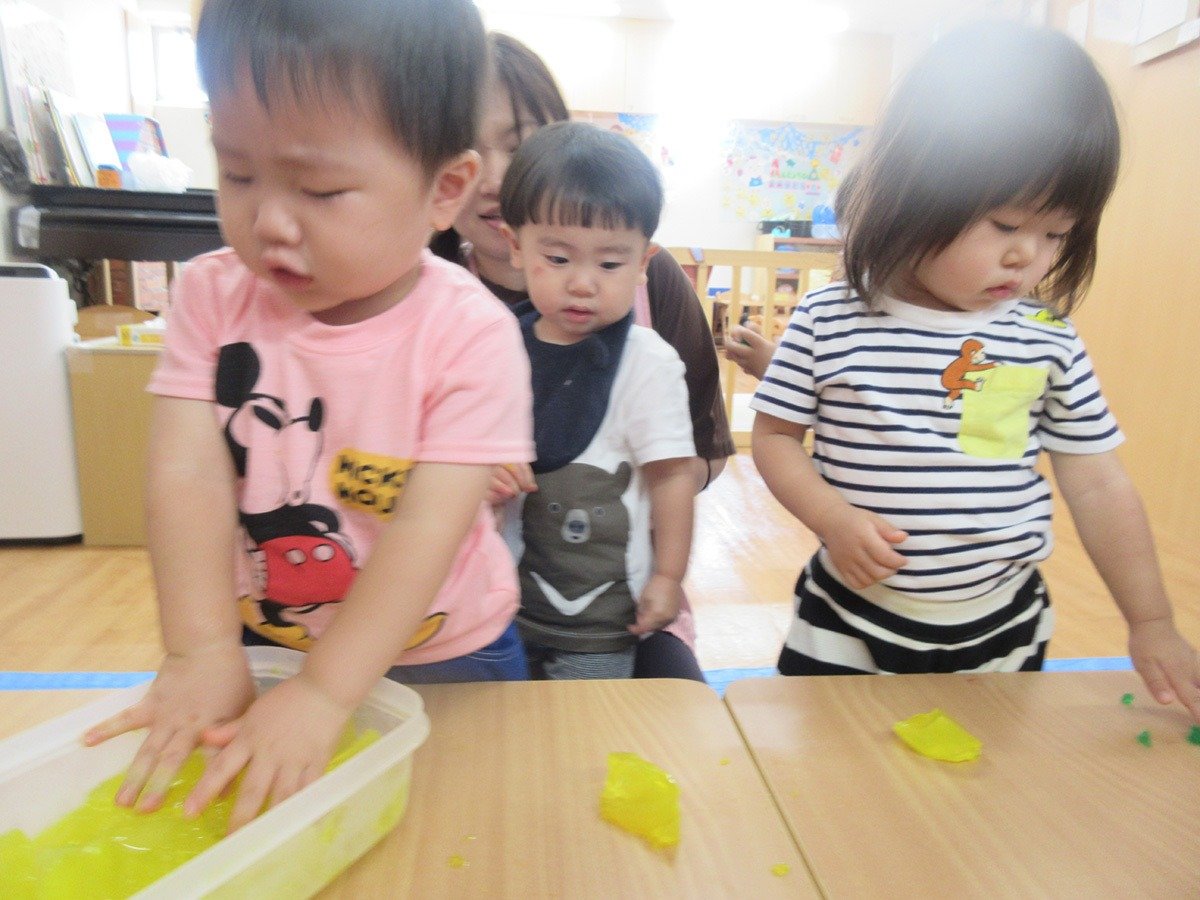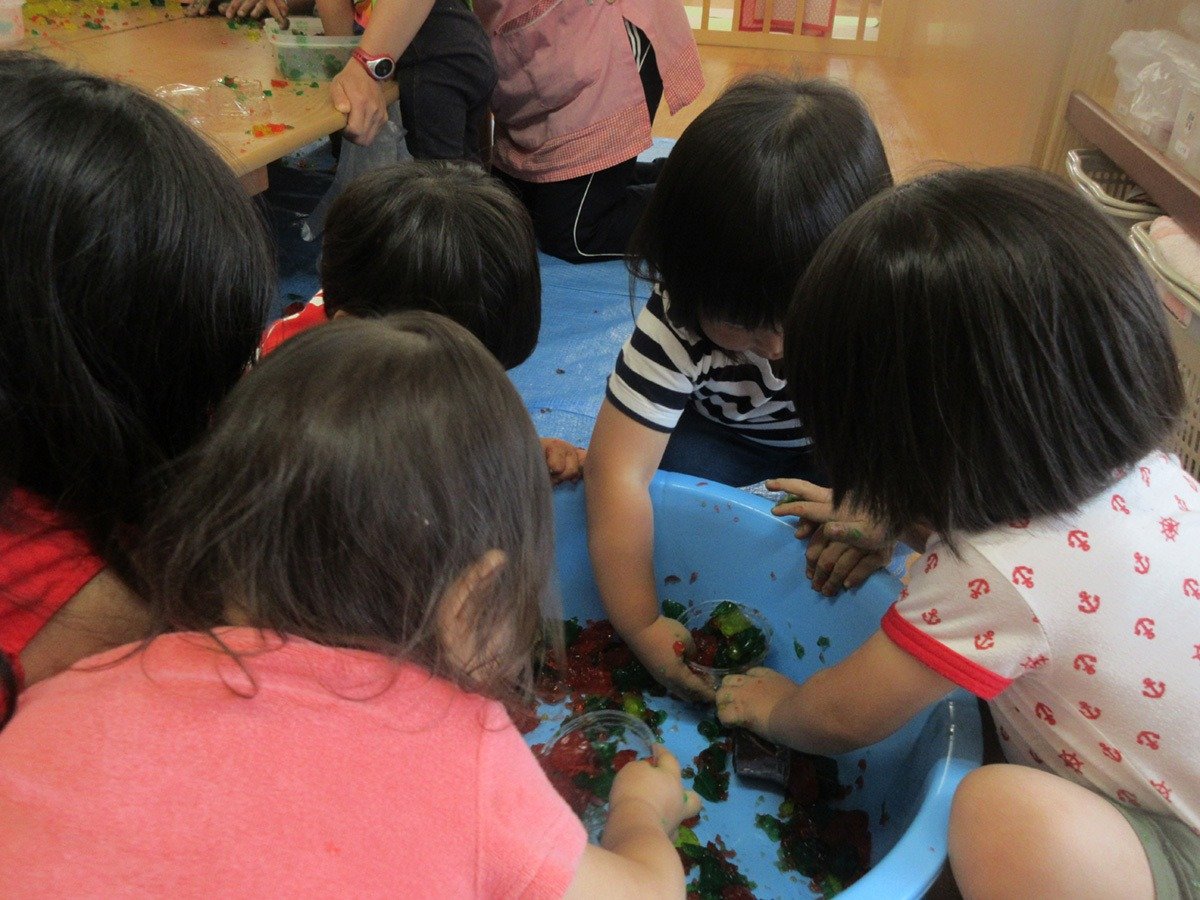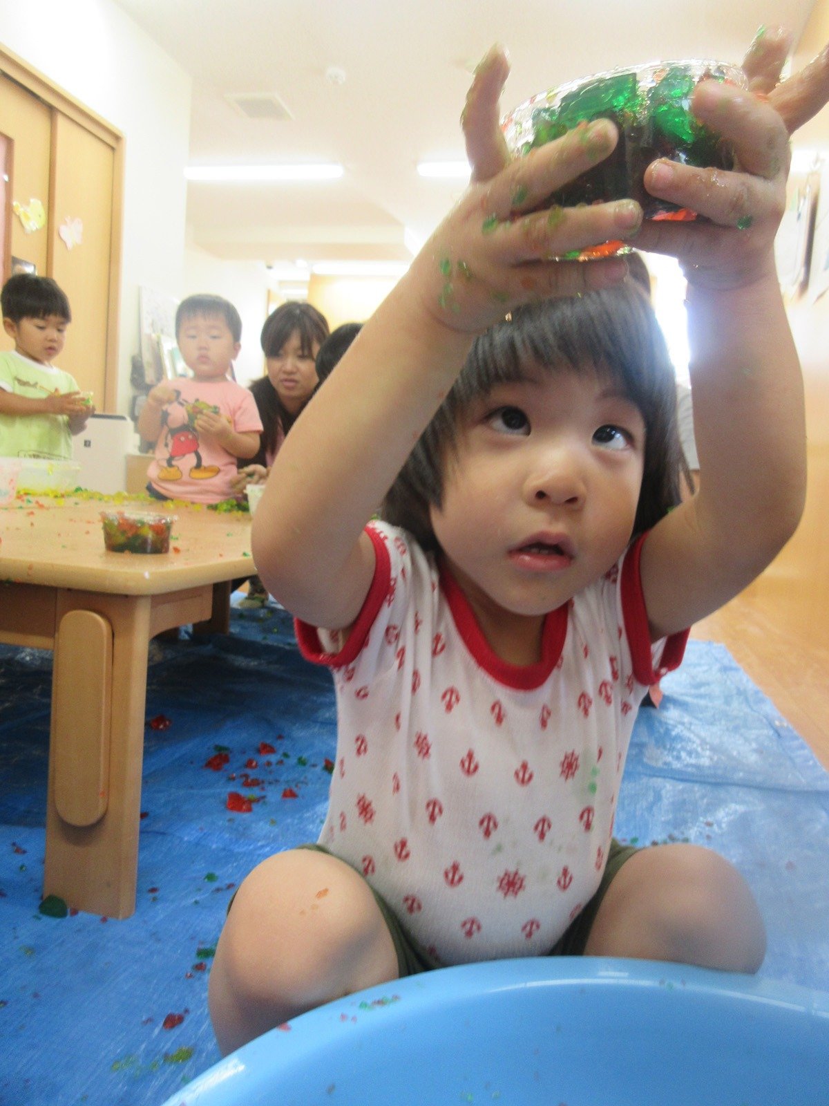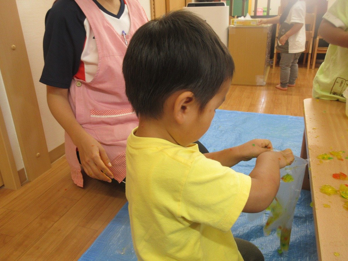 その片栗粉粘土に水を足して、絵の具を足して、くま組さんが絵の具遊びをしました。