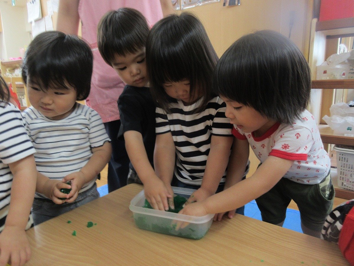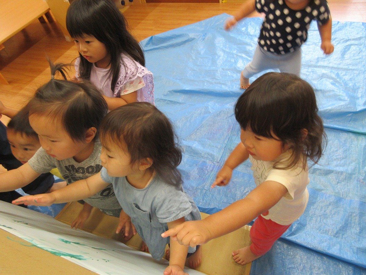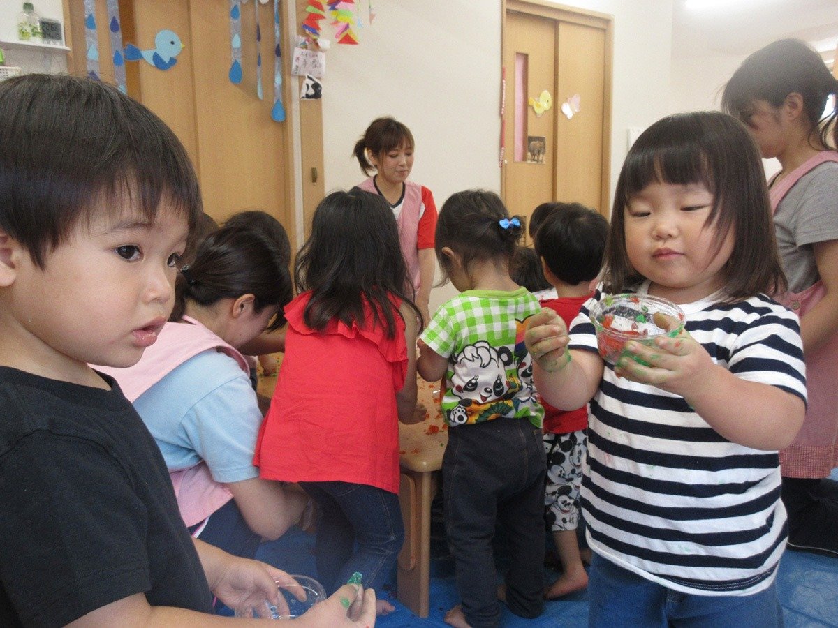 初めは指先でチョンチョンしていたお友達も「おててにつけて」と