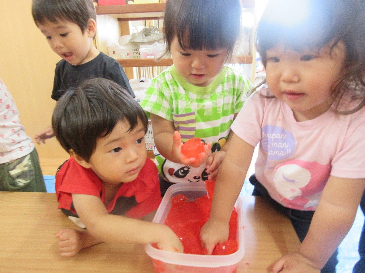 ごっこ遊びをしたり、ペチャペチャと音で大笑いしたり 感触で何かを感じて心がウキウキワクワクしているんでしょうね。