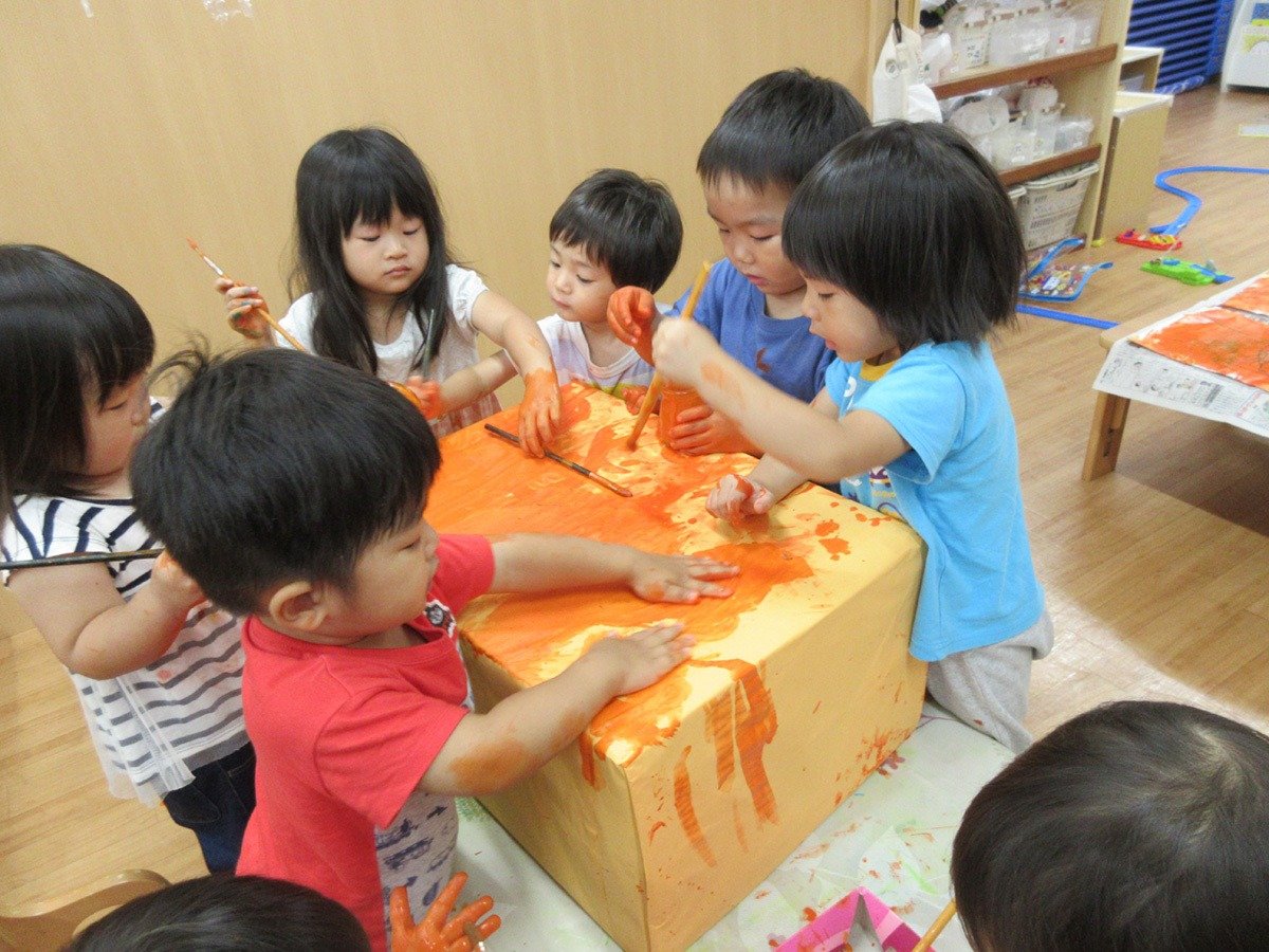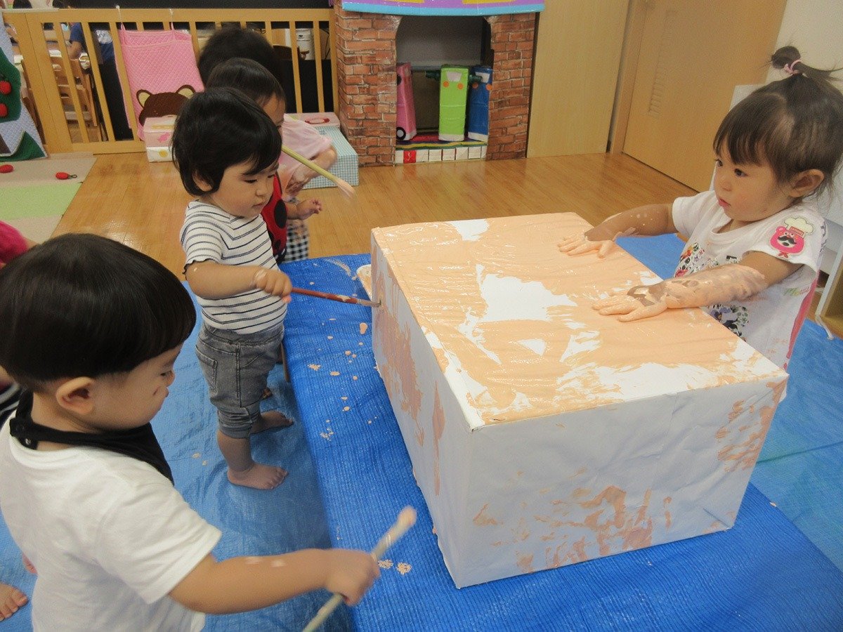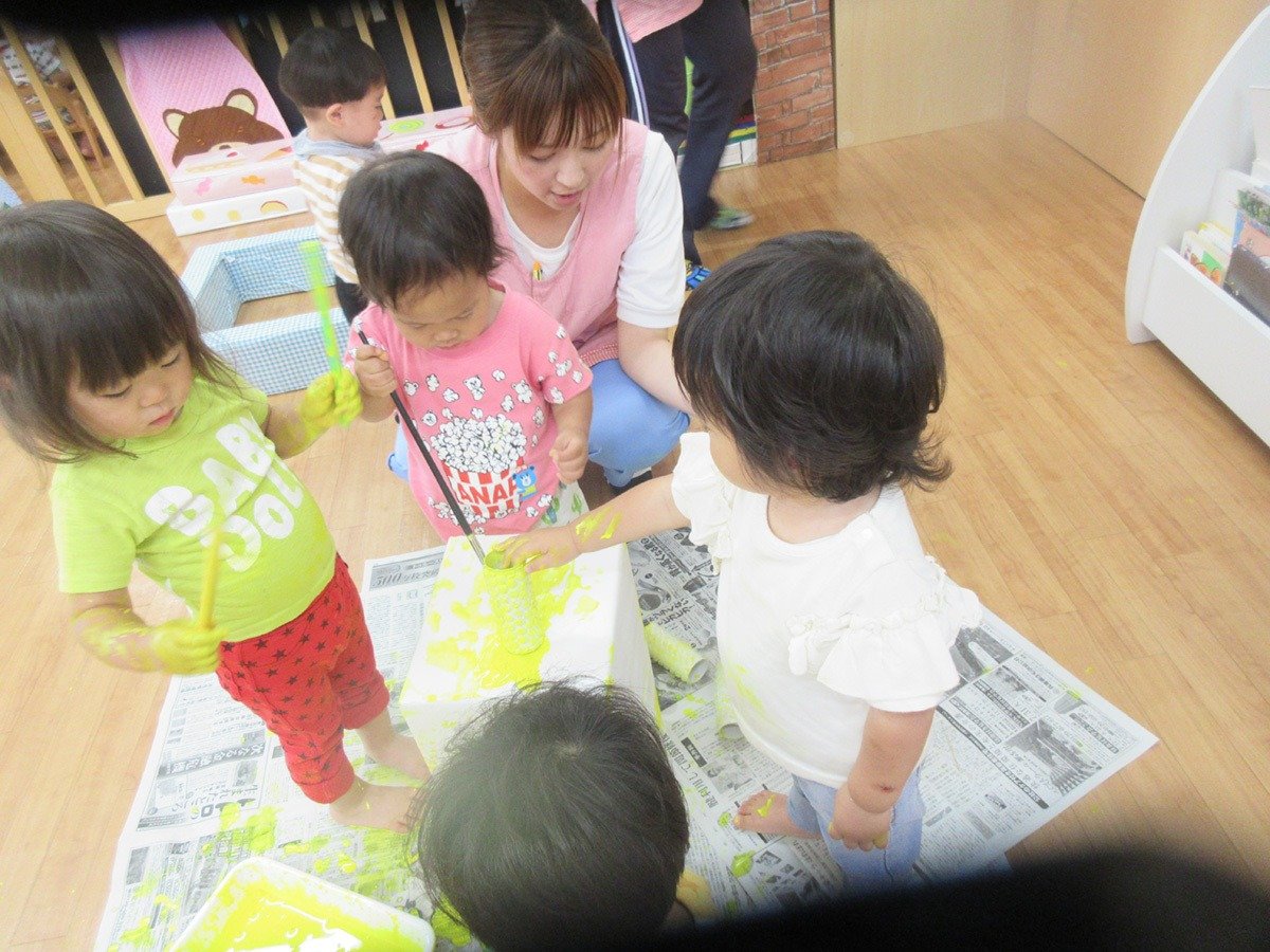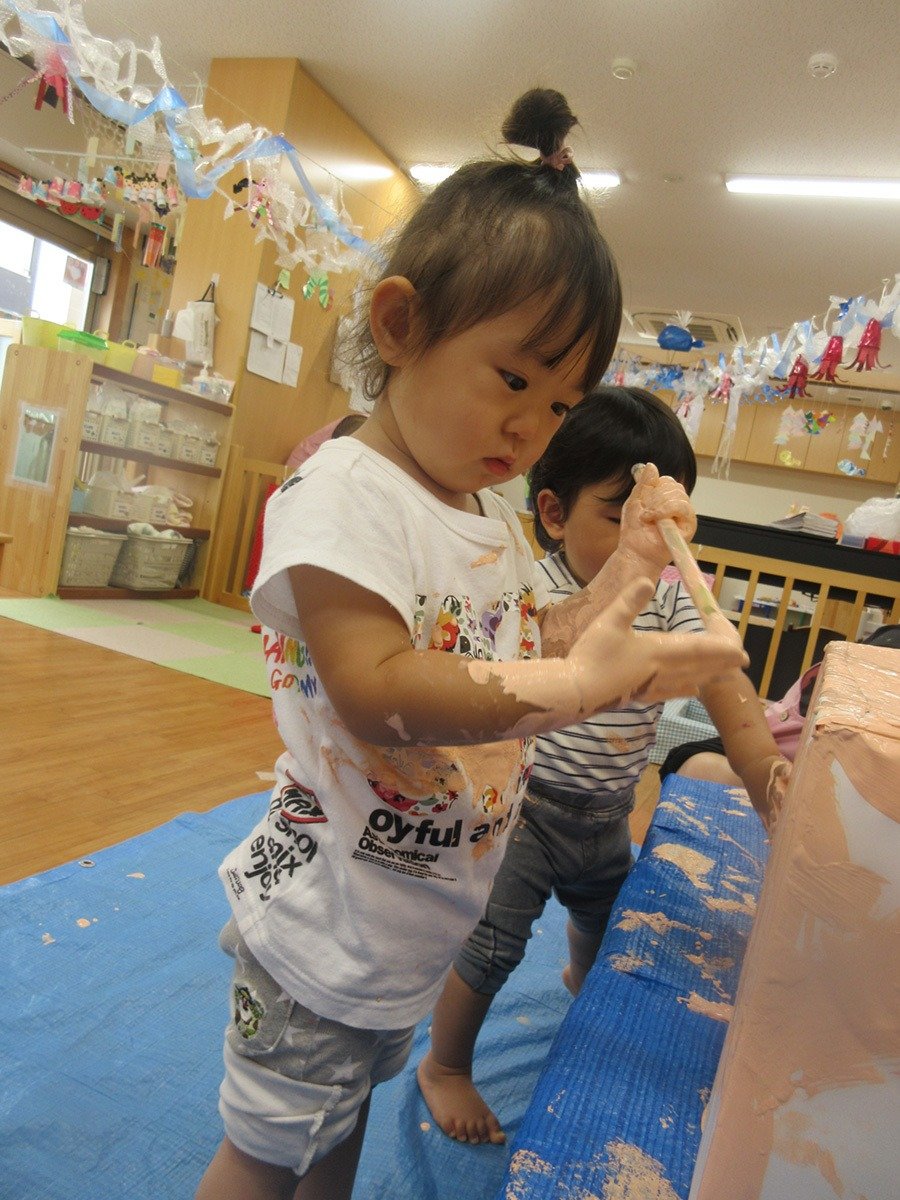 絵の具でヌリヌリしたあと、ひよこ組さん、うさぎ組さんは