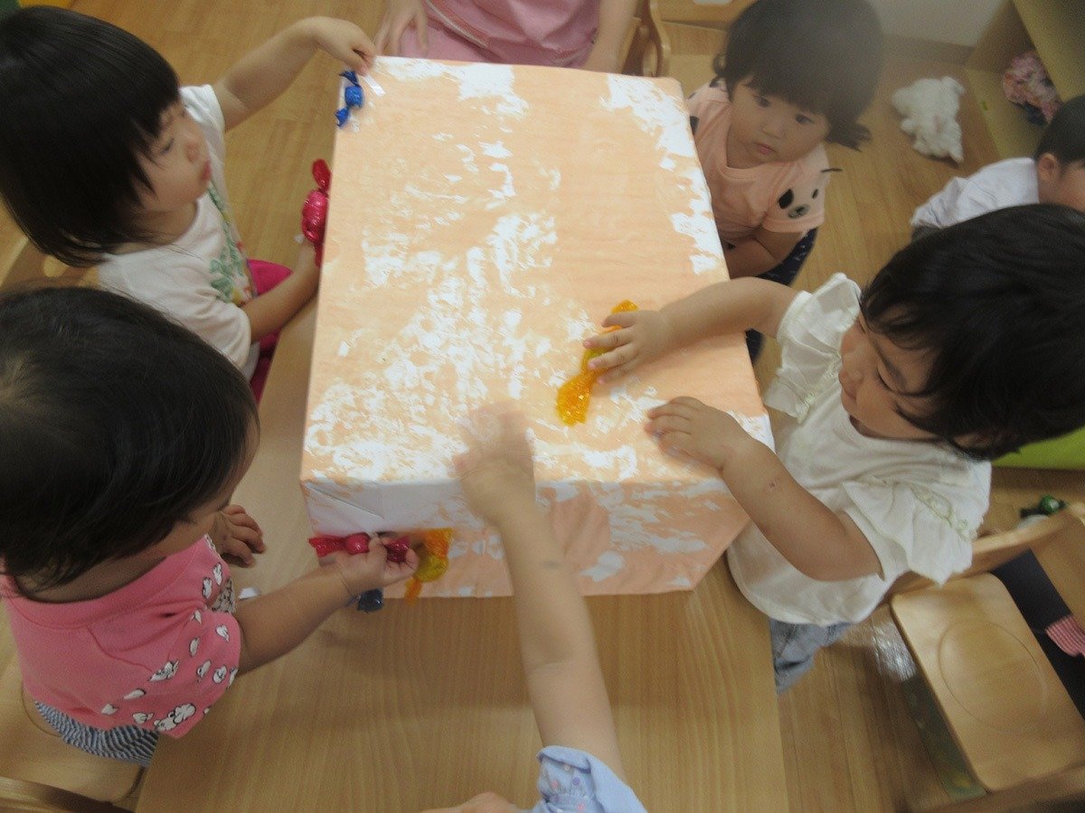 雨の日に楽しんだ絵の具や、シール貼り、トイレットペーパー遊びなどで