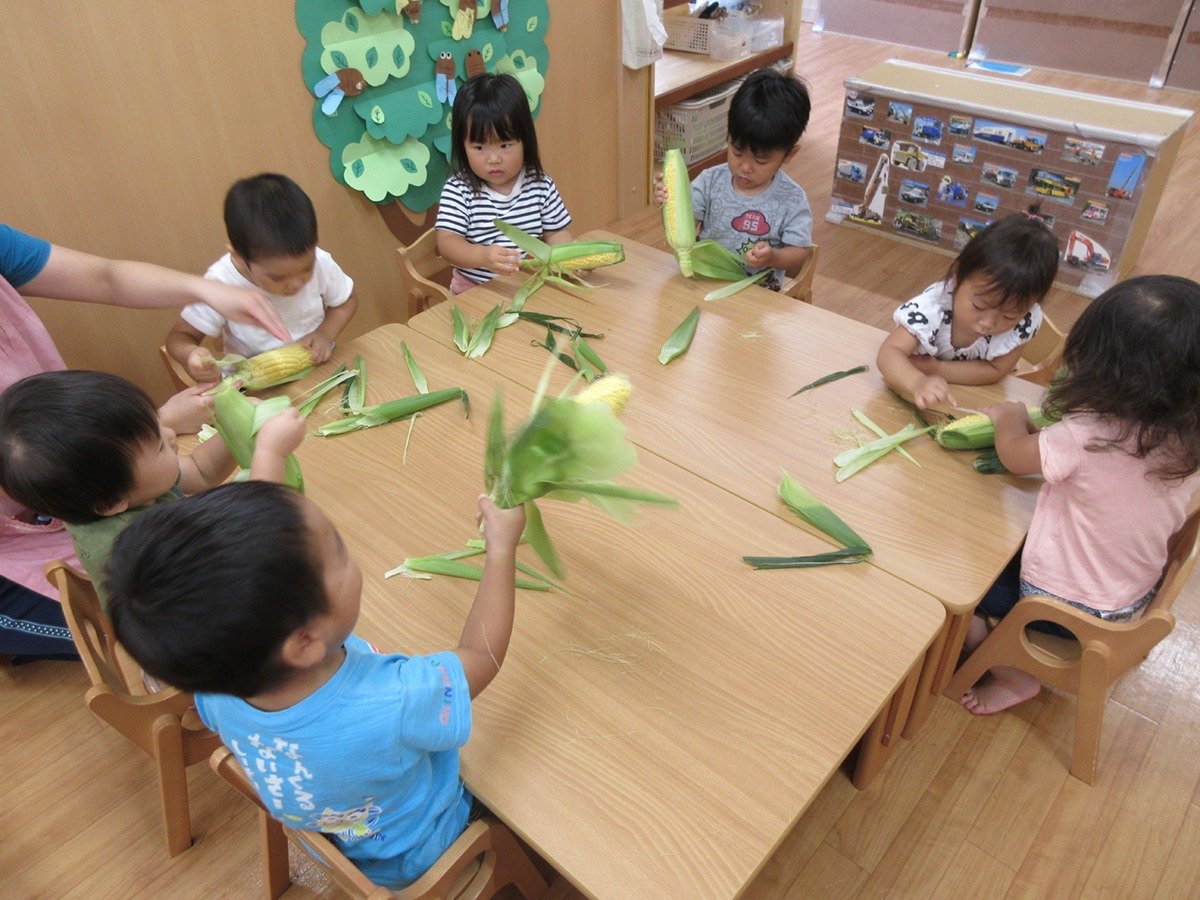 給食のお手伝いでトウモロコシの皮むきをしたり…