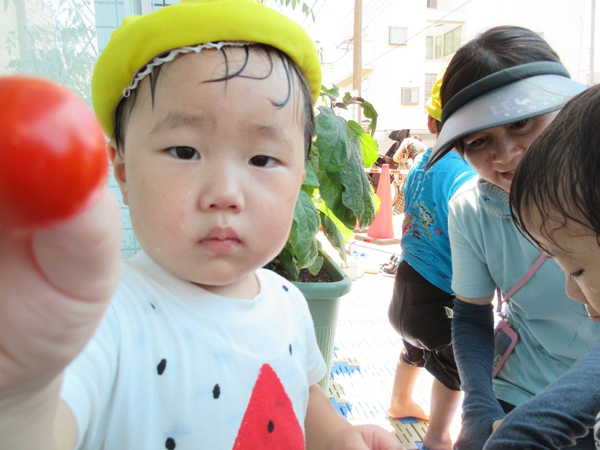 赤色と黄色のミニトマトを「これ、もういけるんちゃう?」と、