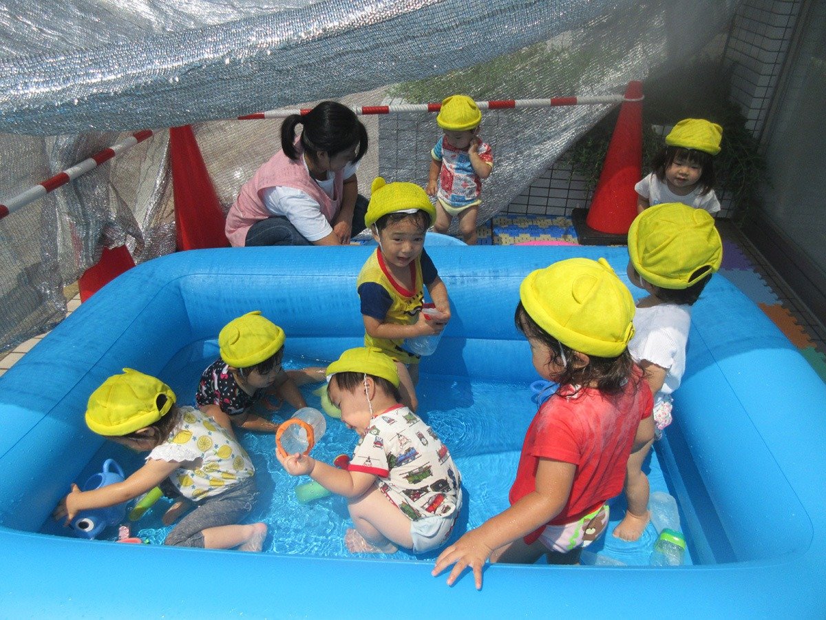 プールは一人ひとりの遊び方や人数などでその日によって3つのグループにわけて