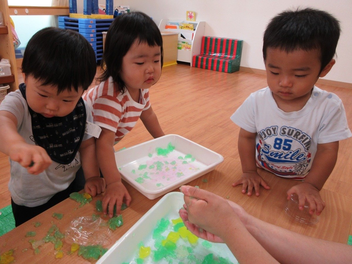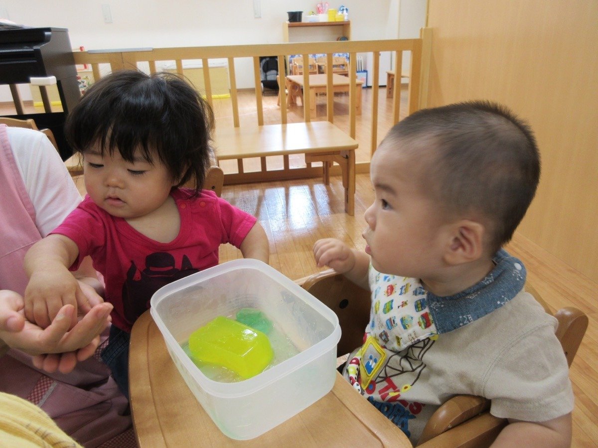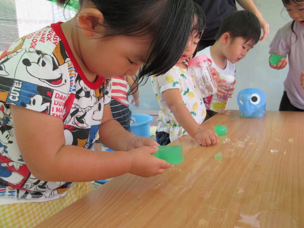 「つめたーい」プルプルのゼリーを手のひらでペチョンペチョン。