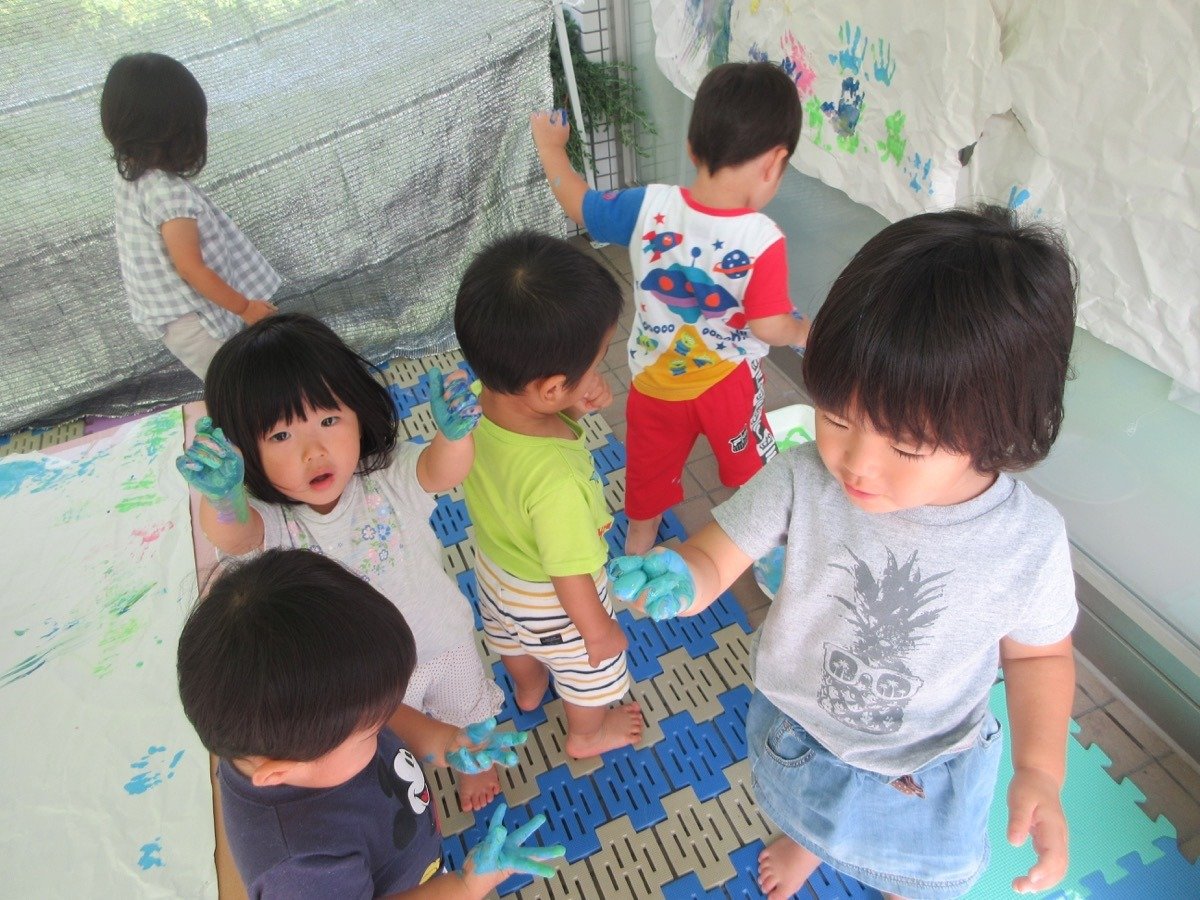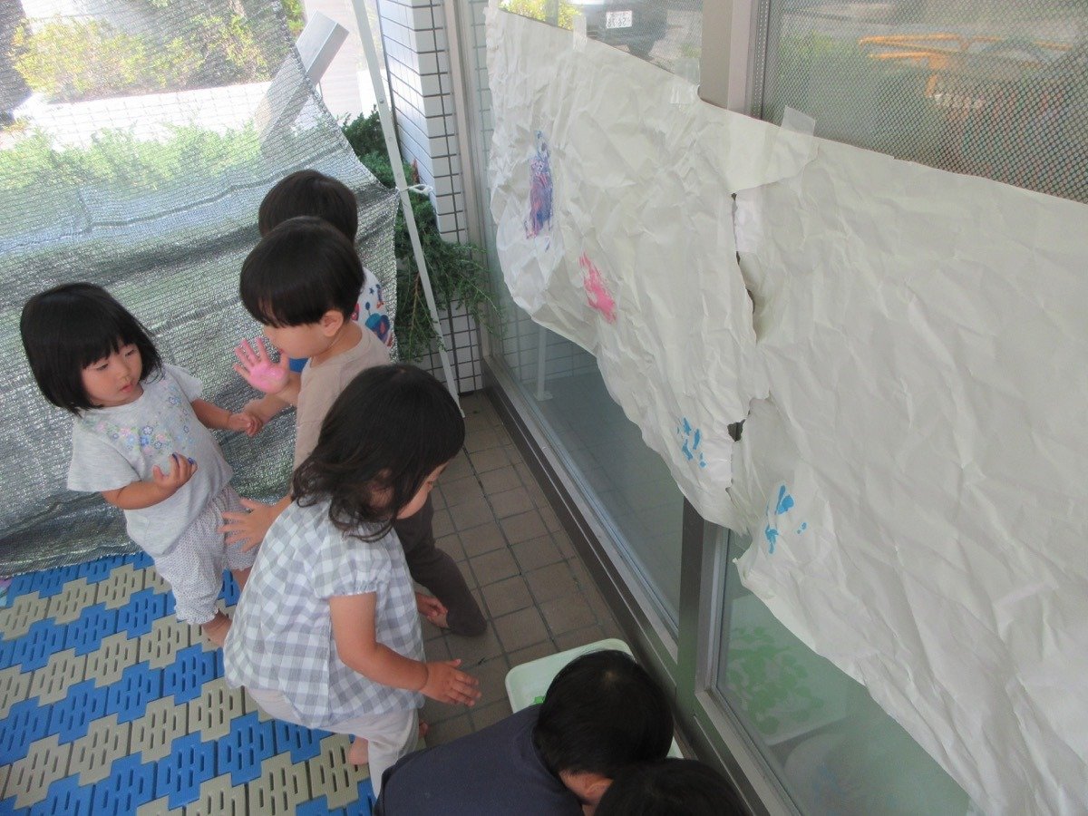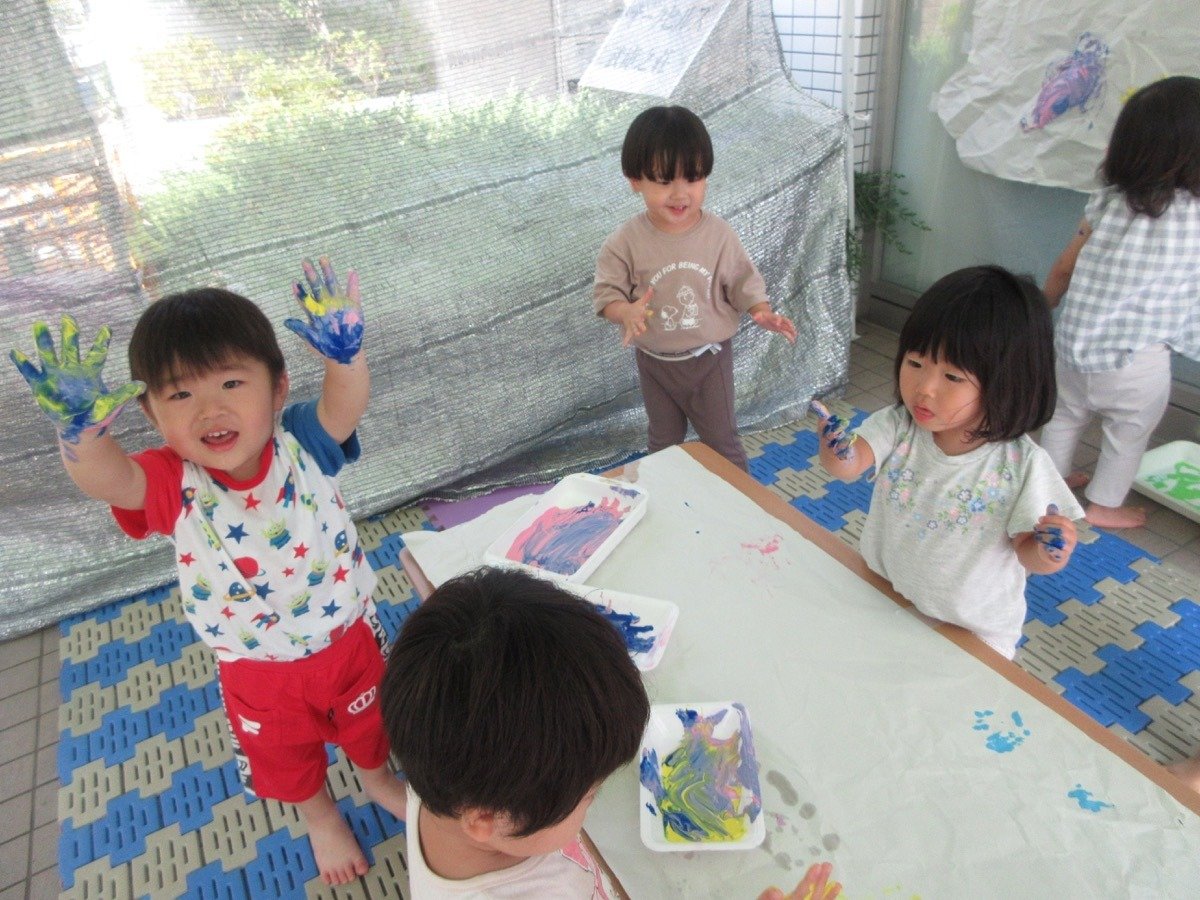 前日、手のひらに絵の具を塗ってペッタンして遊んだことを思い出したKちゃんは