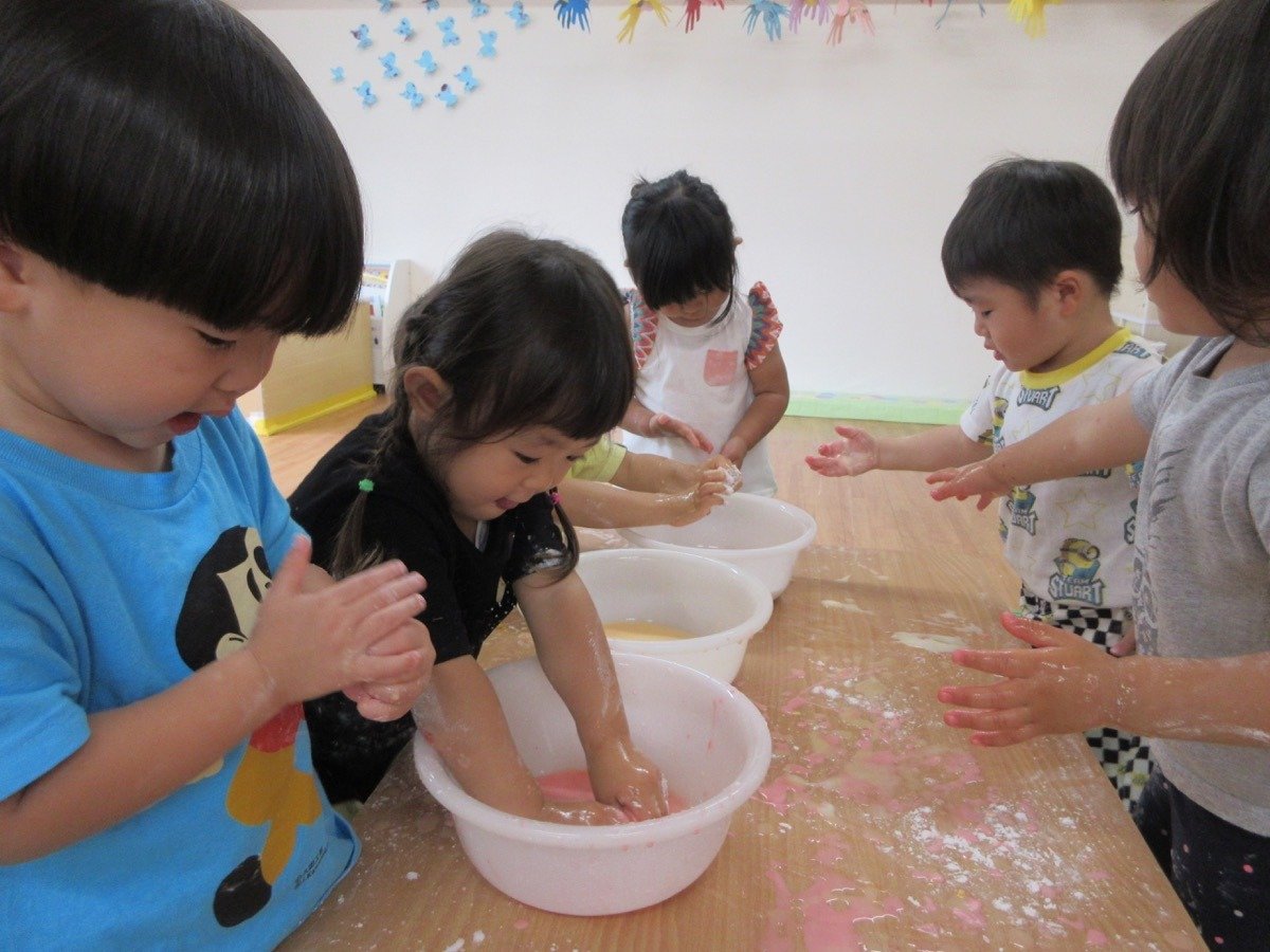 とろとろ~っと流れて 時間を忘れてとろとろの感触を楽しむお友達。