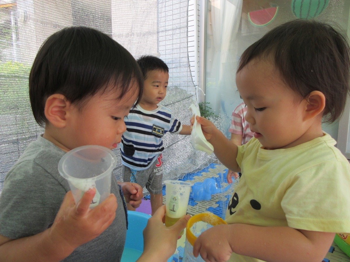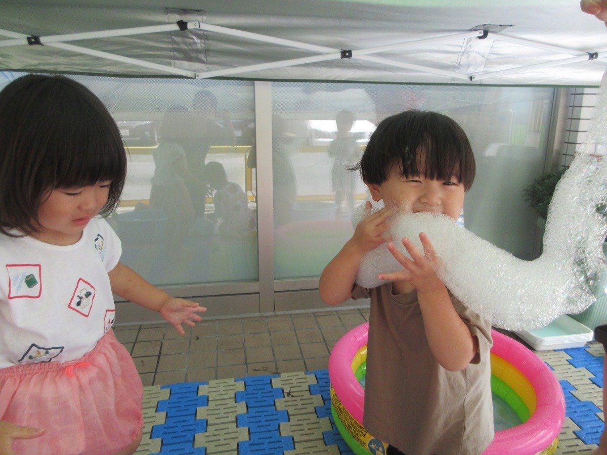 外では、色付きのブクブク泡を手のひらにのせてもらうと