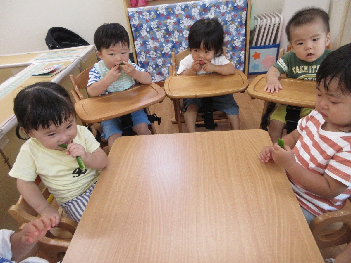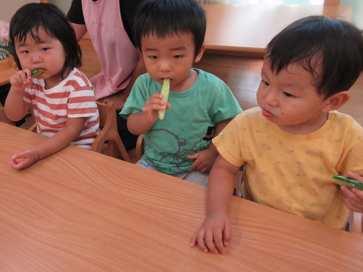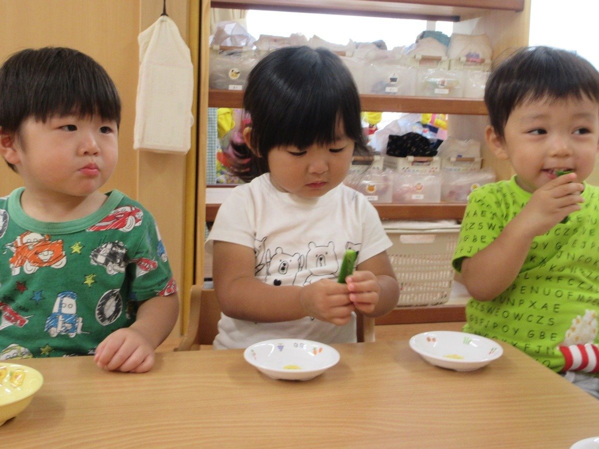 お野菜が苦手なお友達も一口パクっ。ボリボリボリ…二口パクッ…ボリボリボリ…。