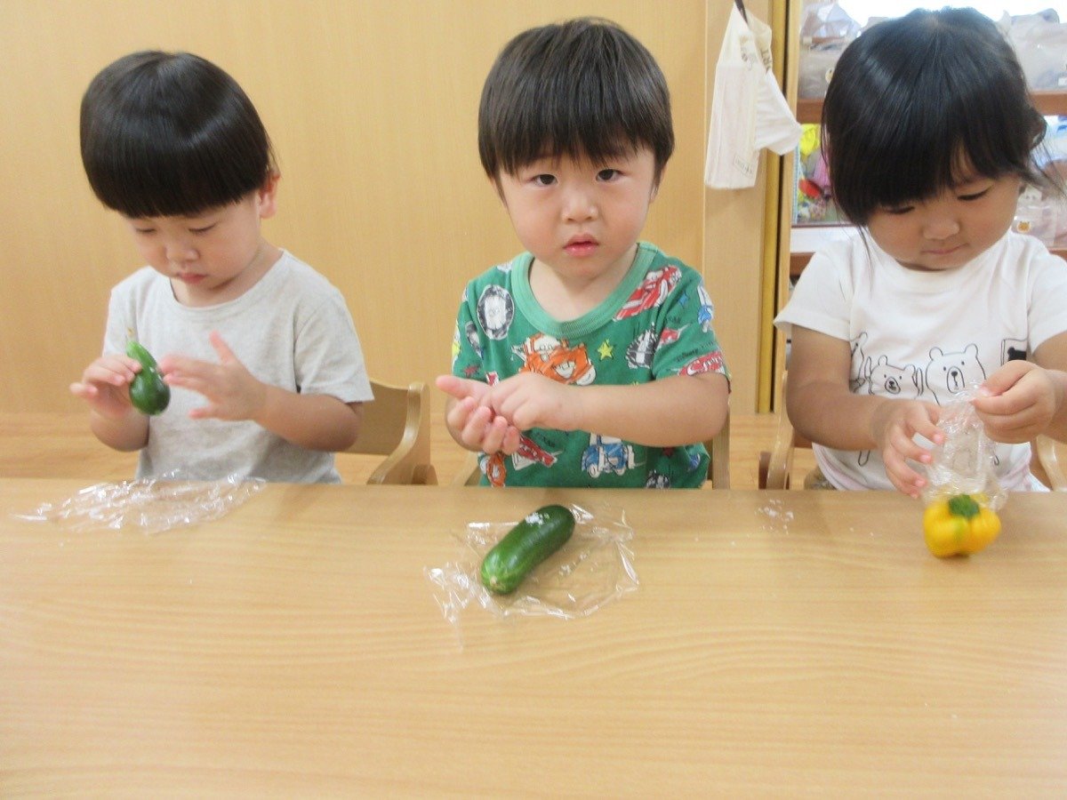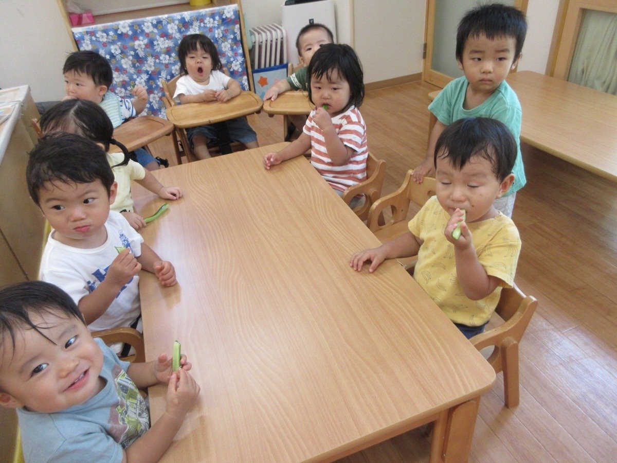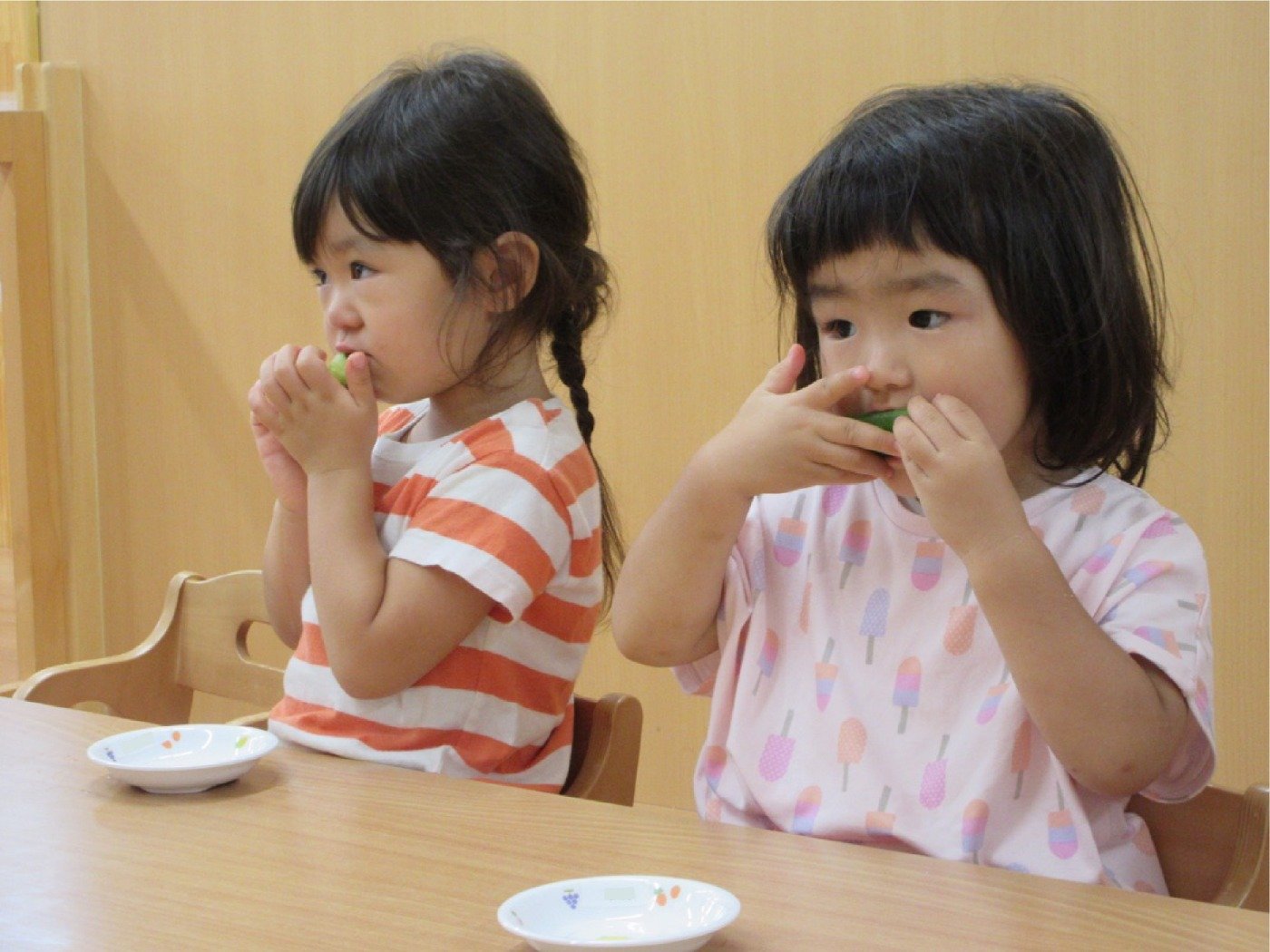 お野菜が苦手なお友達も一口パクっ。ボリボリボリ…二口パクッ…ボリボリボリ…。